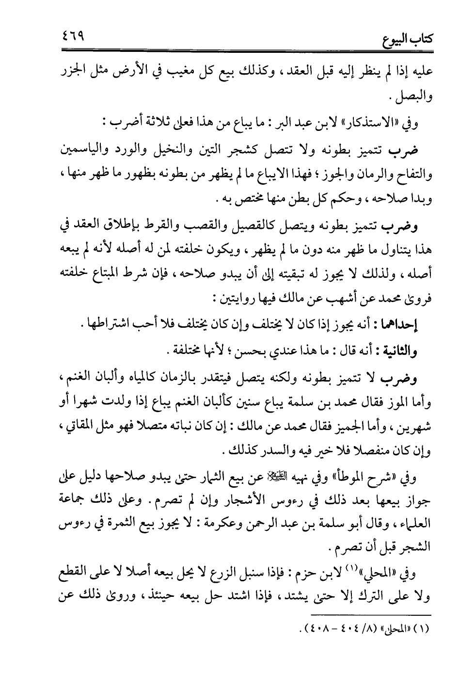 وضرب لا تتميز بطونه ولكنه يتصل فيتقدر بالزمان كالمياه وألبان الغنم، وأما الموز فقال محمد بن سلمة يباع سنين كألبان الغنم يباع إذا ولدت شهرا أو شهرين، وأما الجميز فقال محمد عن مالك: إن كان نباته متصلا فهو مثل المقاتي، وإن كان منفصلا فلا خير فيه والسدر كذلك.