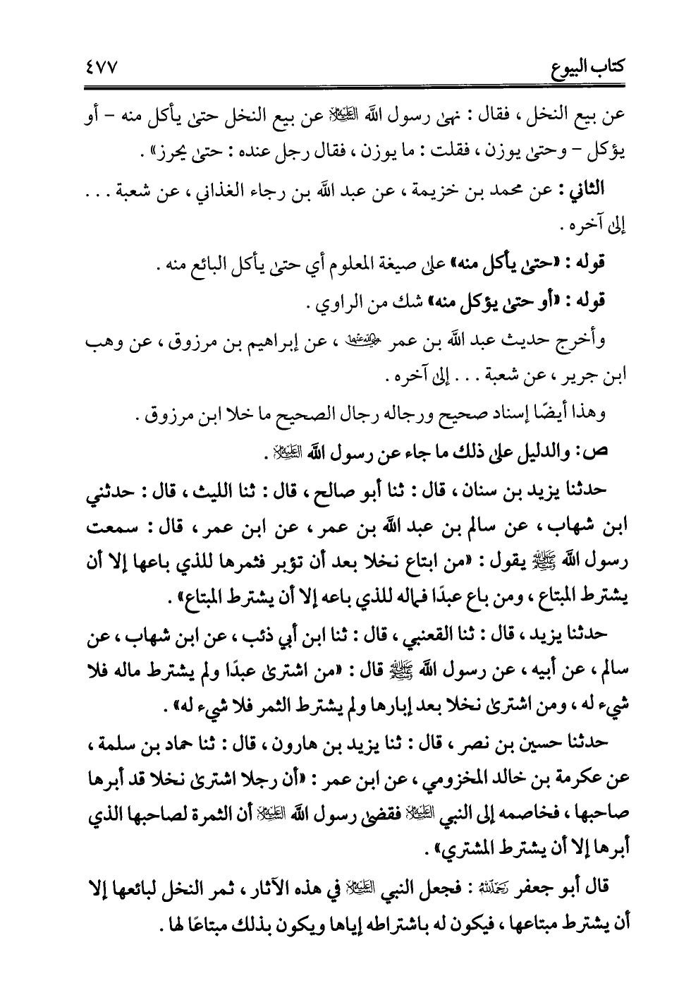 حدثنا حسين بن نصر، قال: ثنا يزيد بن هارون، قال: ثنا حماد بن سلمة، عن عكرمة بن خالد المخزومي، عن ابن عمر: "أن رجلاً اشترى نخلا قد أبرها صاحبها، فخاصمه إلى النبي -عليه السلام- فقضى رسول الله -عليه السلام- أن الثمرة لصاحبها الذي أبرها إلا أن يشترط المشتري".