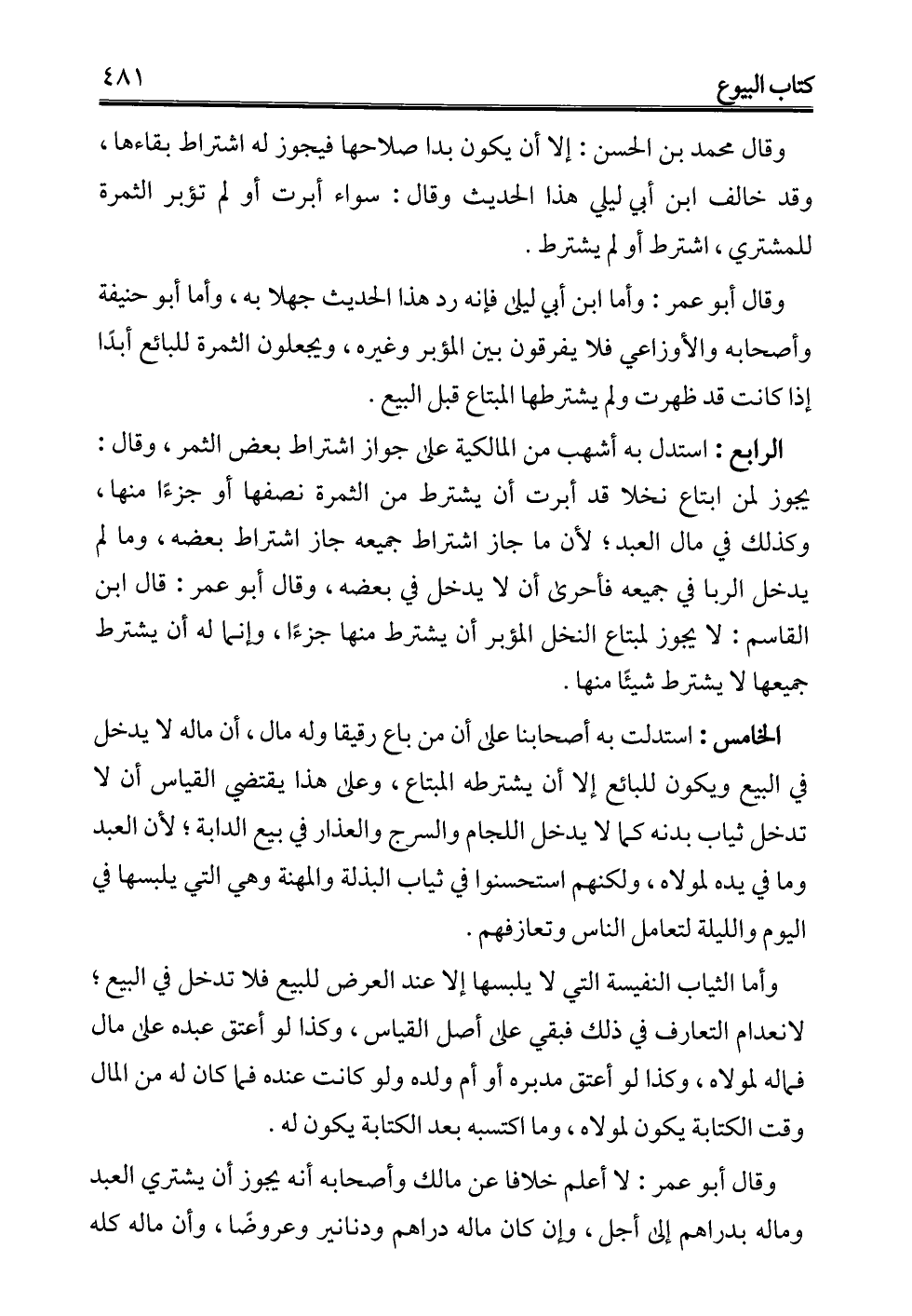 الرابع: استدل به أشهب من المالكية على جواز اشتراط بعض الثمر، وقال: يجوز لمن ابتاع نخلا قد أبرت أن يشترط من الثمرة نصفها أو جزءًا منها، وكذلك في مال العبد؛ لأن ما جاز اشتراط جميعه جاز اشتراط بعضه، وما لم يدخل الربا في جميعه فأحرى أن لا يدخل في بعضه، وقال أبو عمر: قال ابن القاسم: لا يجوز لمبتاع النخل المؤبر أن يشترط منها جزءًا، وإنما له أن يشترط جميعها لا يشترط شيئًا منها.