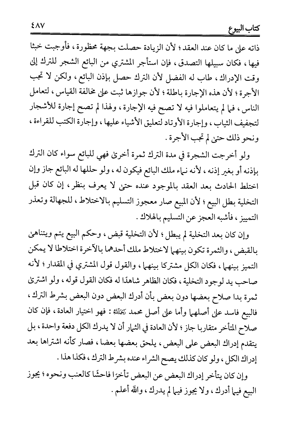 ذاته على ما كان عند العقد؛ لأن الزيادة حصلت بجهة محظورة، فأوجبت خبثا فيها، فكان سبيلها التصدق، فإن استأجر المشتري من البائع الشجر للترك إلى وقت الإدراك، طاب له الفضل لأن الترك حصل بإذن البائع، ولكن لا تجب الأجرة؛ لأن هذه الإجارة باطلة؛ لأن جوازها ثبت على مخالفة القياس، لتعامل الناس، فما لم يتعاملوا فيه لا تصح فيه الإجارة، ولهذا لم تصح إجارة للأشجار لتجفيف الثياب، وإجارة الأوتاد لتعليق الأشياء عليها، وإجارة الكتب للقراءة، ونحو ذلك حتى لم تجب الأجرة.