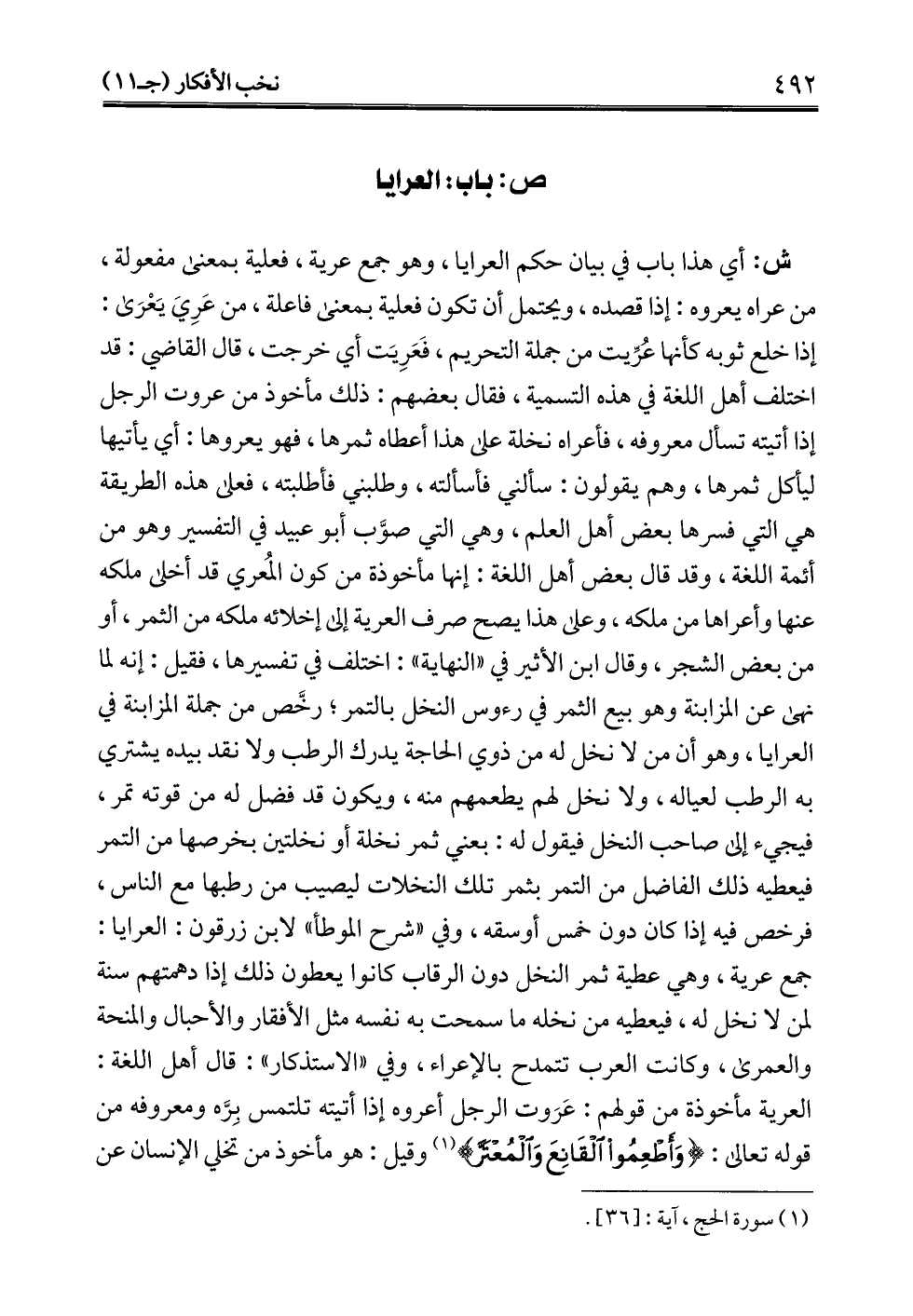 ش: أي هذا باب في بيان حكم العرايا، وهو جمع عرية، فعلية بمعنى مفعولة، من عراه يعروه: إذا قصده، ويحتمل أن تكون فعلية بمعنى فاعلة، من عَرِيَ يَعْرَى: إذا خلع ثوبه كأنها عُرِّيت من جملة التحريم، فَعَرِيَت أي خرجت، قال القاضي: قد اختلف أهل اللغة في هذه التسمية، فقال بعضهم: ذلك مأخوذ من عروت الرجل إذا أتيته تسأل معروفه، فأعراه نخلة على هذا أعطاه ثمرها، فهو يعروها: أي يأتيها ليأكل ثمرها، وهم يقولون: سألني فأسألته، وطلبني فأطلبته، فعلى هذه الطريقة هي التي فسرها بعض أهل العلم، وهي التي صوَّب أبو عبيد في التفسير وهو من أئمة اللغة، وقد قال بعض أهل اللغة: إنها مأخوذة من كون المُعري قد أخلى ملكه عنها وأعراها من ملكه، وعلى هذا يصح صرف العرية إلى إخلائه ملكه من الثمر، أو من بعض الشجر، وقال ابن الأثير في "النهاية": اختلف في تفسيرها، فقيل: إنه لما نهى عن المزابنة وهو بيع الثمر في رءوس النخل بالتمر؛ رخَّص من جملة المزابنة في العرايا، وهو أن من لا نخل له من ذوي الحاجة يدرك الرطب ولا نقد بيده يشتري به الرطب لعياله، ولا نخل لهم يطعمهم منه، ويكون قد فضل له من قوته تمر، فيجيء إلى صاحب النخل فيقول له: بعني ثمر نخلة أو نخلتين بخرصها من التمر فيعطيه ذلك الفاضل من التمر بثمر تلك النخلات ليصيب من رطبها مع الناس، فرخص فيه إذا كان دون خمس أوسقه، وفي "شرح الموطأ" لابن زرقون: العرايا: جمع عرية، وهي عطية ثمر النخل دون الرقاب كانوا يعطون ذلك إذا دهمتهم سنة لمن لا نخل له، فيعطيه من نخله ما سمحت به نفسه مثل الأفقار والأحبال والمنحة والعمرى، وكانت العرب تتمدح بالإعراء، وفي "الاستذكار": قال أهل اللغة: العرية مأخوذة من قولهم: عَرَوت الرجل أعروه إذا أتيته تلتمس بِرَّه ومعروفه من قوله تعالى: {وَأَطْعِمُوا الْقَانِعَ وَالْمُعْتَرَّ} (¬1) وقيل: هو مأخوذ من تخلي الإنسان عن