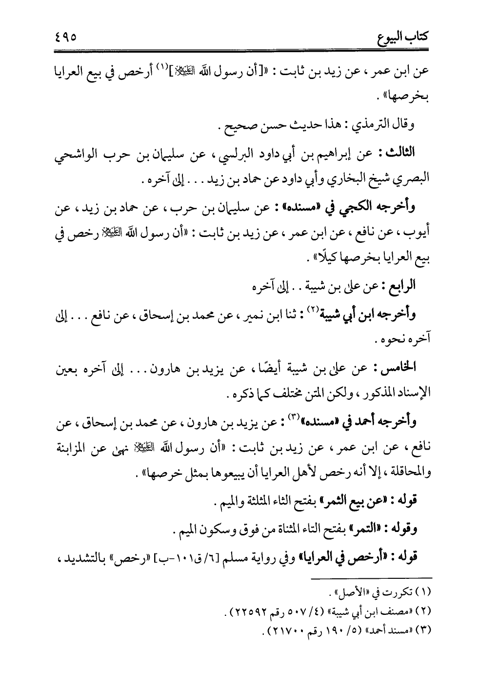 وأخرجه الكجي في "مسنده": عن سليمان بن حرب، عن حماد بن زيد، عن أيوب، عن نافع، عن ابن عمر، عن زيد بن ثابت: "أن رسول الله -عليه السلام- رخص في بيع العرايا بخرصها كيلًا".
