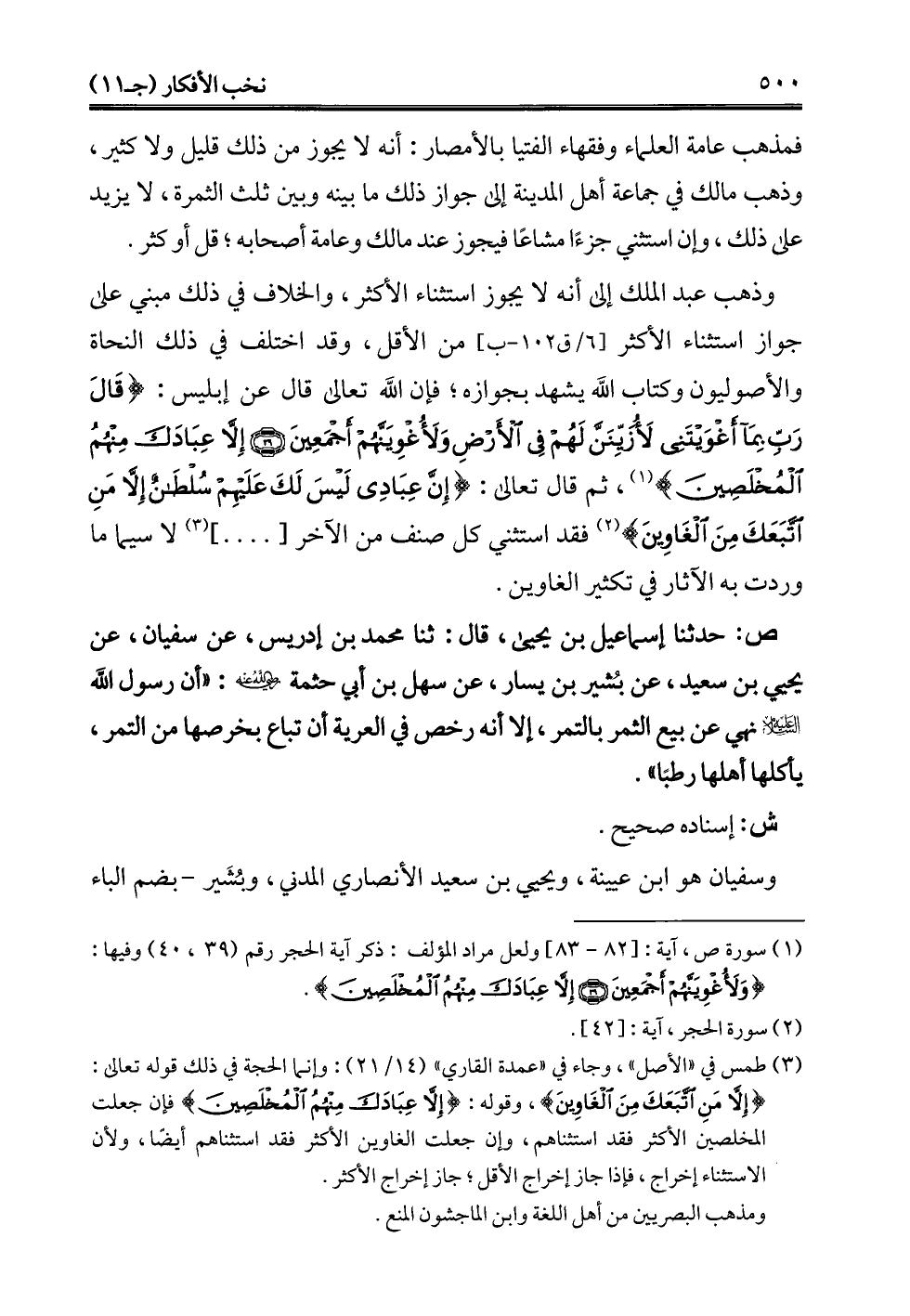 (¬3) طمس في "الأصل"، وجاء في "عمدة القاري" (14/ 21): وإنما الحجة في ذلك قوله تعالى: {إِلَّا مَنِ اتَّبَعَكَ مِنَ الْغَاوِينَ}، وقوله: {إِلَّا عِبَادَكَ مِنْهُمُ الْمُخْلَصِينَ} فإن جعلت المخلصين الأكثر فقد استثناهم، وإن جعلت الغاوين الأكثر فقد استثناهم أيضًا، ولأن الاستثناء إخراج، فإذا جاز إخراج الأقل؛ جاز إخراج الأكثر.