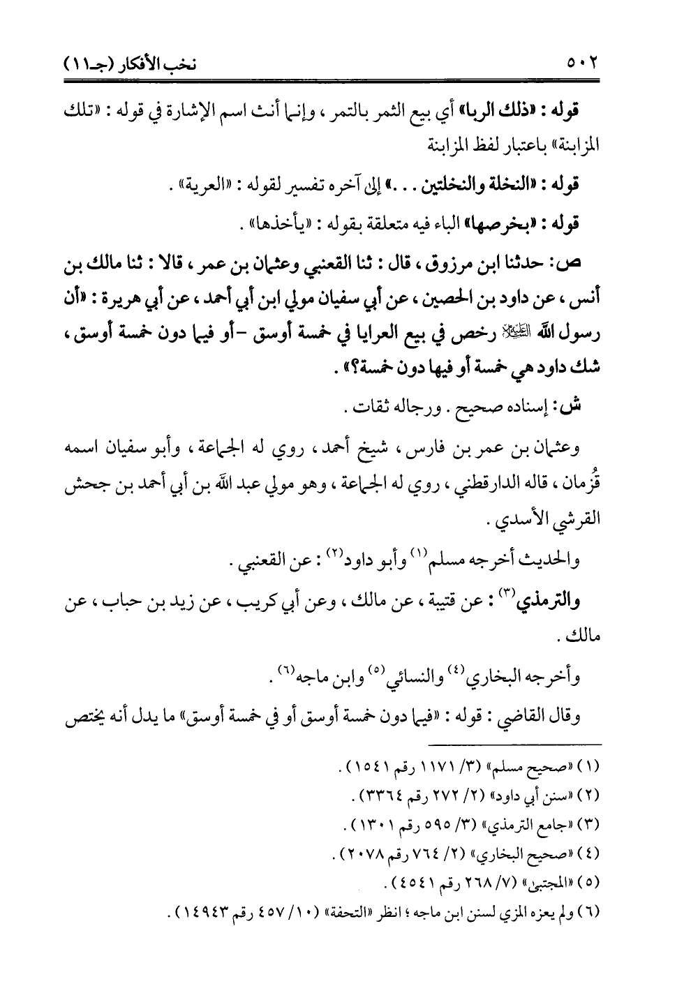 ص: حدثنا ابن مرزوق، قال: ثنا القعنبي وعثمان بن عمر، قالا: ثنا مالك بن أنس، عن داود بن الحصين، عن أبي سفيان مولي ابن أبي أحمد، عن أبي هريرة: "أن رسول الله -عليه السلام- رخص في بيع العرايا في خمسة أوسق -أو فيما دون خمسة أوسق، شك داود هي خمسة أو فيها دون خمسة؟ ".