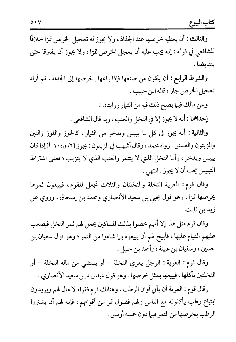 والثانية: أنه يجوز في كل ما ييبس ويدخر من الثمار، كالجوز واللوز والتين والزيتون والفستق. رواه محمد، وقال أشهب في الزيتون: يجوز إذا كان ييبس ويدخر، وأما النخل الذي لا يتتمر والعنب الذي لا يتزبب؛ فعلى اشتراط التيبيس يجب أن لايجوز. انتهي.