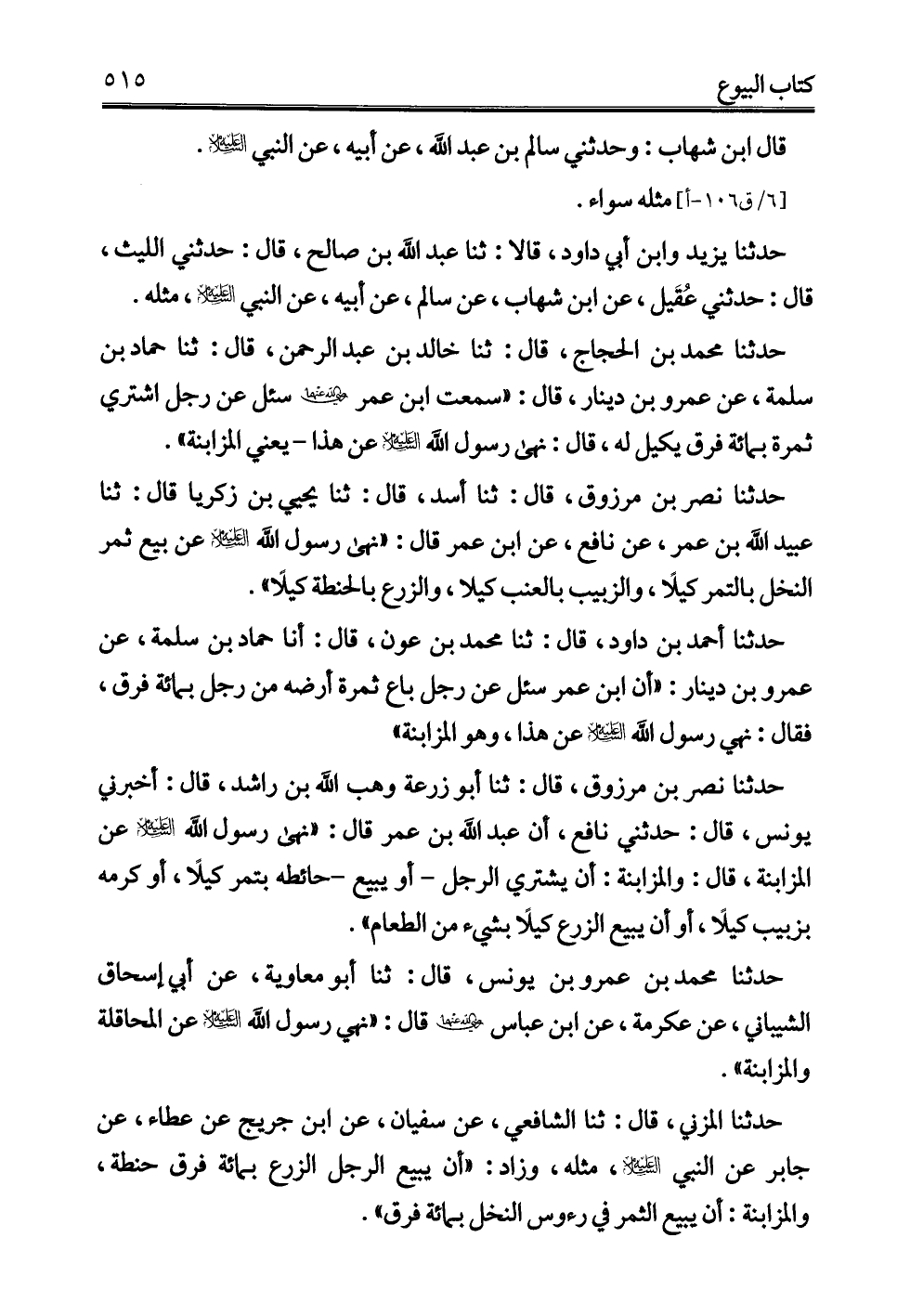 حدثنا نصر بن مرزوق، قال: ثنا أسد، قال: ثنا يحيى بن زكريا قال: ثنا عبيد الله بن عمر، عن نافع، عن ابن عمر قال: نهى رسول الله -عليه السلام- عن بيع ثمر النخل بالتمر كيلاً، والزبيب بالعنب كيلا، والزرع بالحنطة كيلًا".