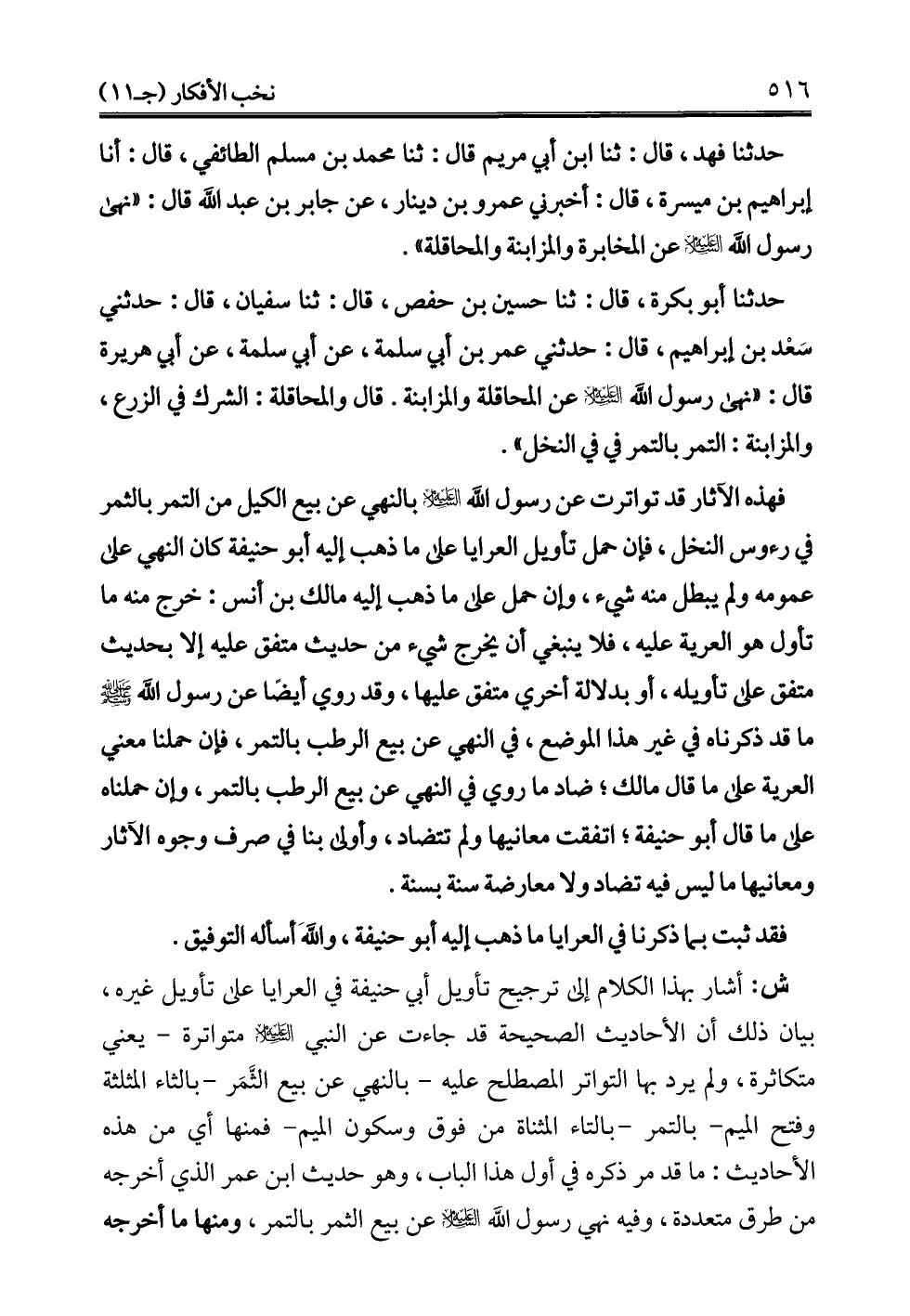 ش: أشار بهذا الكلام إلى ترجيح تأويل أبي حنيفة في العرايا على تأويل غيره، بيان ذلك أن الأحاديث الصحيحة قد جاءت عن النبي -عليه السلام- متواترة -يعني متكاثرة، ولم يرد بها التواتر المصطلح عليه- بالنهي عن بيع الثَّمَر -بالثاء المثلثة وفتح الميم- بالتمر -بالتاء المثناة من فوق وسكون الميم- فمنها أي من هذه الأحاديث: ما قد مر ذكره في أول هذا الباب، وهو حديث ابن عمر الذي أخرجه من طرق متعددة، وفيه نهي رسول الله -عليه السلام- عن بيع الثمر بالتمر، ومنها ما أخرجه