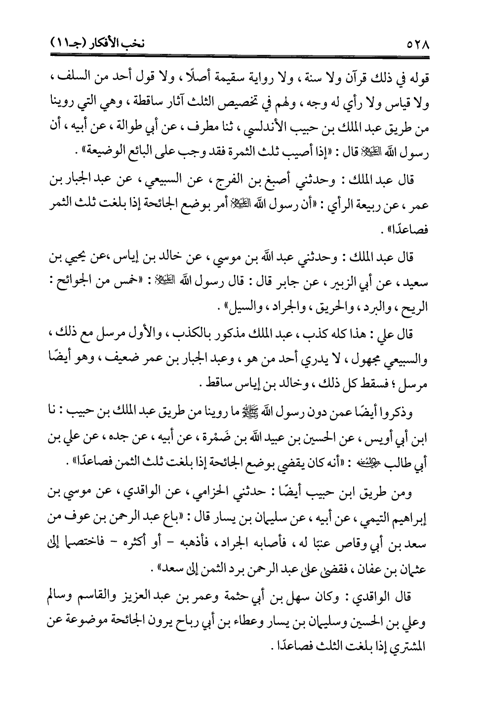 قوله في ذلك قرآن ولا سنة، ولا رواية سقيمة أصلًا ولا قول أحد من السلف، ولا قياس ولا رأي له وجه، ولهم في تخصيص الثلث آثار ساقطة، وهي التي روينا من طريق عبد الملك بن حبيب الأندلسي، ثنا مطرف، عن أبي طوالة، عن أبيه، أن رسول الله -عليه السلام- قال: "إذا أصيب ثلث الثمرة فقد وجب على البائع الوضيعة".
