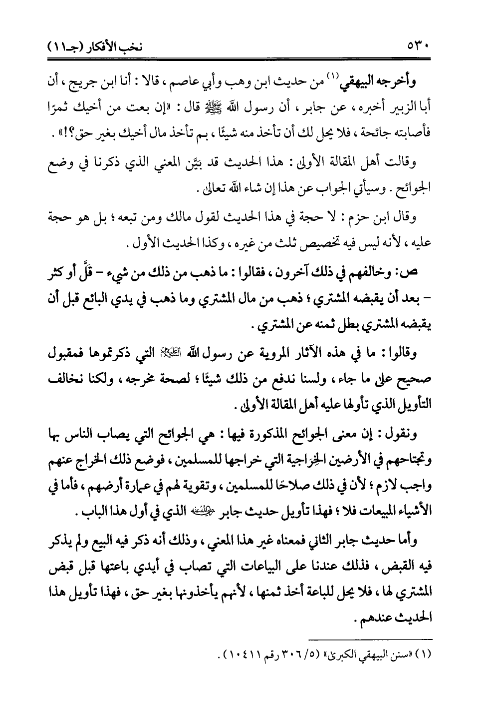 وأما حديث جابر الثاني فمعناه غير هذا المعني، وذلك أنه ذكر فيه البيع ولم يذكر فيه القبض، فذلك عندنا على البياعات التي تصاب في أيدي باعتها قبل قبض المشتري لها، فلا يحل للباعة أخذ ثمنها، لأنهم يأخذونها بغير حق، فهذا تأويل هذا الحديث عندهم.