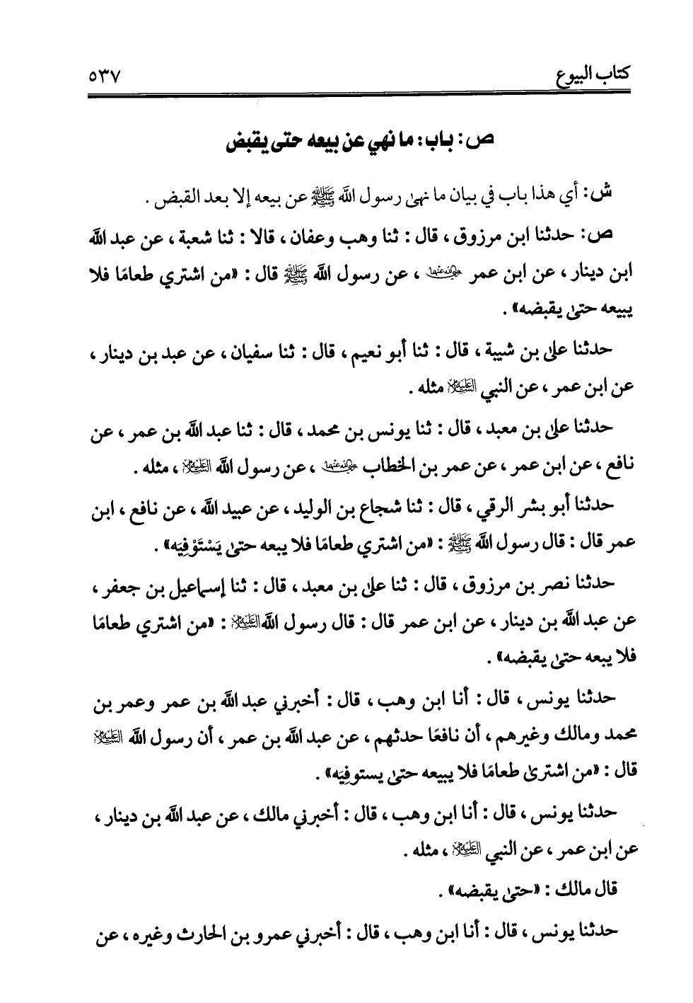 حدثنا يونس، قال: أنا ابن وهب، قال: أخبرني عبد الله بن عمر وعمر بن محمد ومالك وغيرهم، أن نافعًا حدثهم، عن عبد الله بن عمر، أن رسول الله -عليه السلام- قال: "من اشترى طعامًا فلا يبيعه حتى يستوفِيَه".