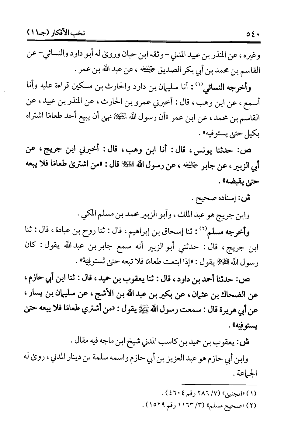 وأخرجه مسلم (¬2): ثنا إسحاق بن إبراهيم، قال: ثنا روح بن عبادة، قال: ثنا ابن جريج، قال: حدثني أبو الزبير أنه سمع جابر بن عبد الله يقول: كان رسول الله -عليه السلام- يقول: "إذا ابتعت طعامًا فلا تبعه حتى تَستوفِيَهُ".