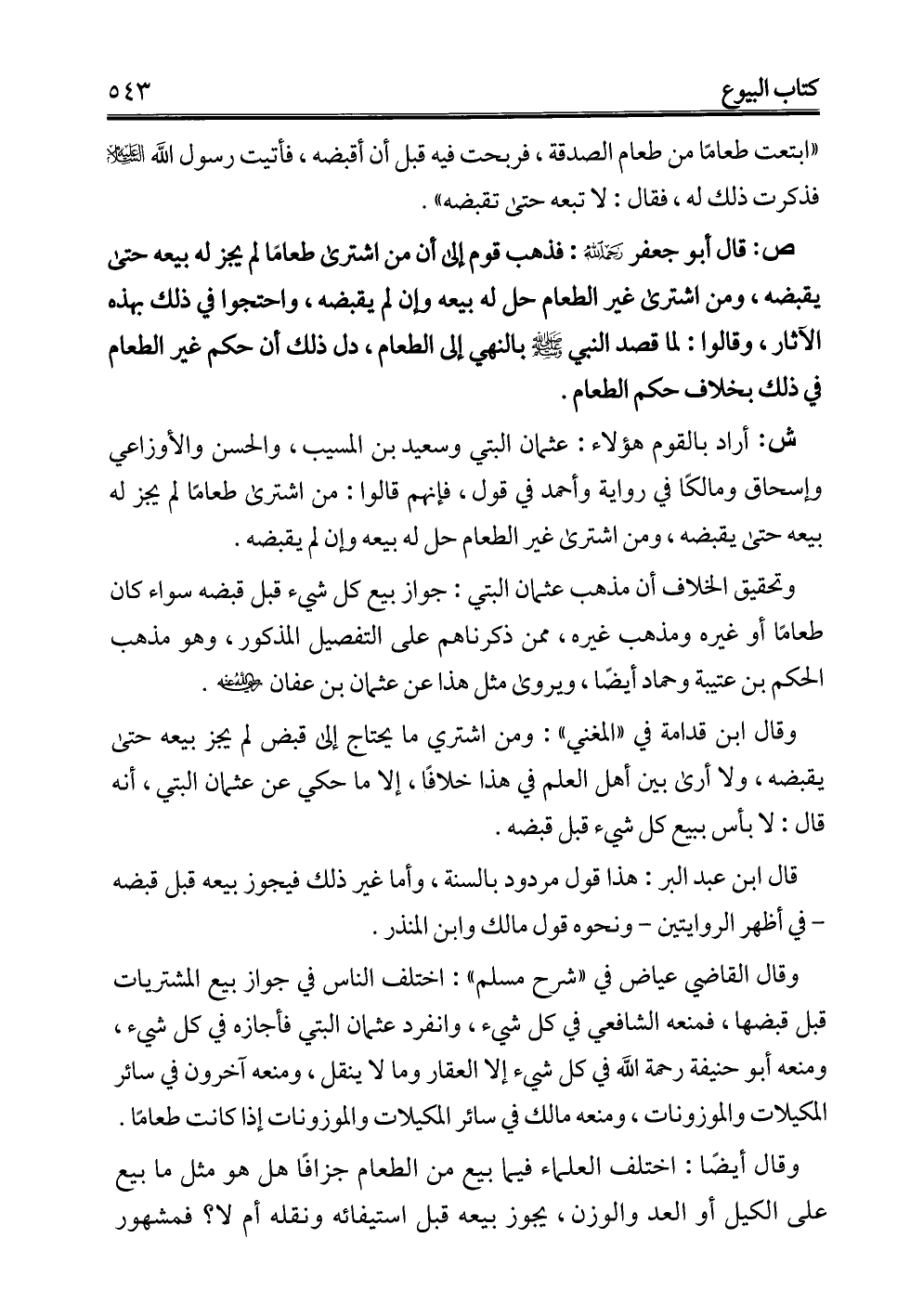 ش: أراد بالقوم هؤلاء: عثمان البتي وسعيد بن المسيب، والحسن والأوزاعي وإسحاق ومالكًا في رواية وأحمد في قول، فإنهم قالوا: من اشترى طعامًا لم يجز له بيعه حتى يقبضه، ومن اشترى غير الطعام حل له بيعه وان لم يقبضه.