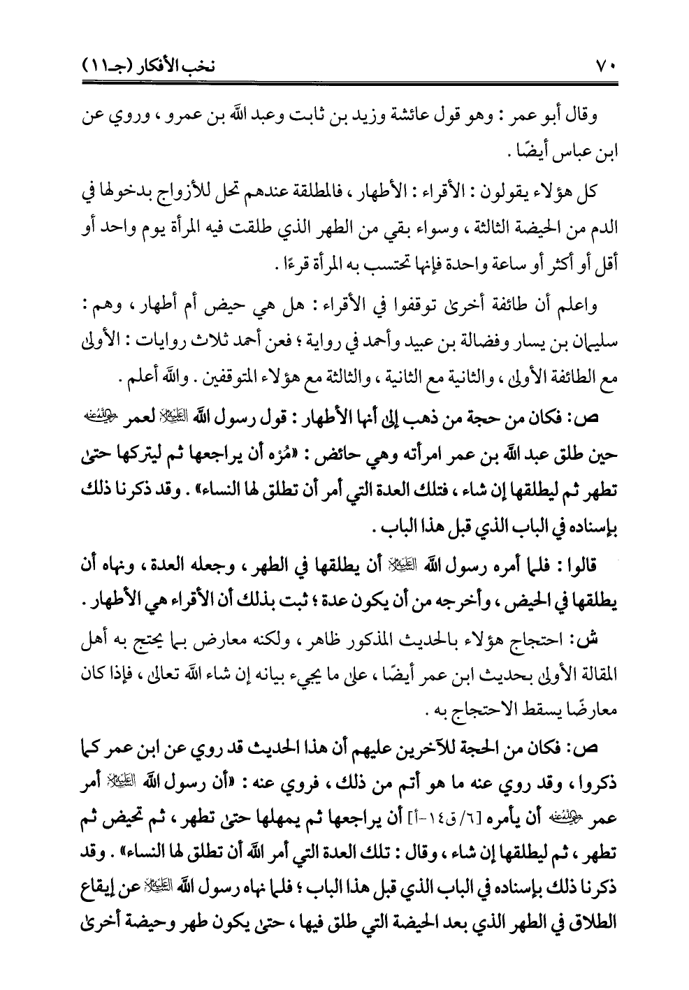 ص: فكان من الحجة للآخرين عليهم أن هذا الحديث قد روي عن ابن عمر كما ذكروا، وقد روي عنه ما هو أتم من ذلك، فروي عنه: "أن رسول الله -عليه السلام- أمر عمر -رضي الله عنه- أن يأمره أن يراجعها ثم يمهلها حتى تطهر، ثم تحيض ثم تطهر، ثم ليطلقها إن شاء، وقال: تلك العدة التي أمر الله أن تطلق لها النساء". وقد ذكرنا ذلك بإسناده في الباب الذي قبل هذا الباب؛ فلما نهاه رسول الله -عليه السلام- عن إيقاع الطلاق في الطهر الذي بعد الحيضة التي طلق فيها، حتى يكون طهر وحيضة أخرى