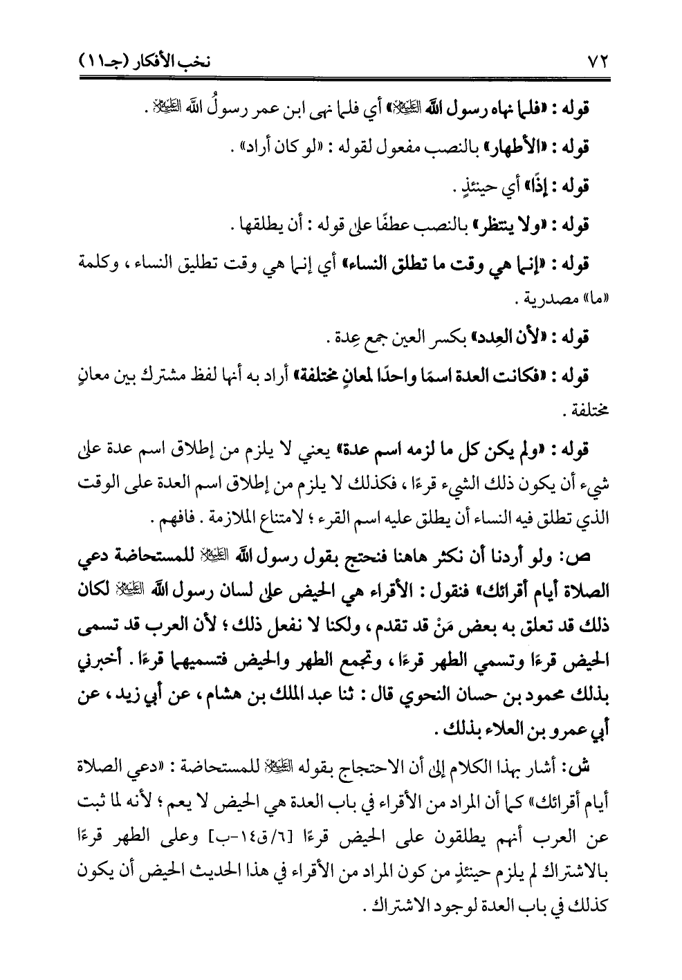 ش: أشار بهذا الكلام إلى أن الاحتجاج بقوله -عليه السلام- للمستحاضة: "دعي الصلاة أيام أقرائك" كما أن المراد من الأقراء في باب العدة هي الحيض لا يعم؛ لأنه لما ثبت عن العرب أنهم يطلقون على الحيض قرءًا وعلى الطهر قرءًا بالاشتراك لم يلزم حينئذٍ من كون المراد من الأقراء في هذا الحديث الحيض أن يكون كذلك في باب العدة لوجود الاشتراك.