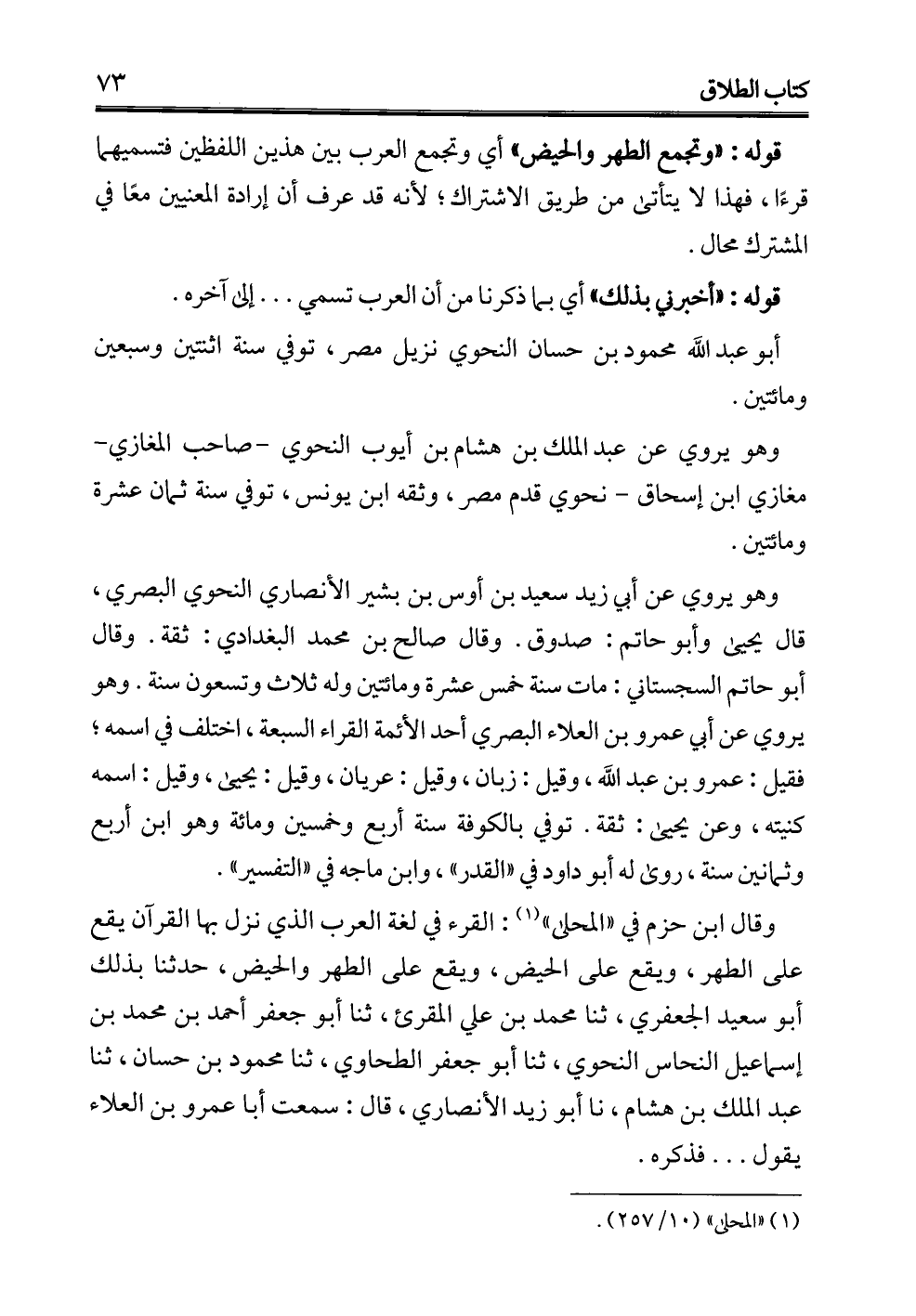 وقال ابن حزم في "المحلى" (¬1): القرء في لغة العرب الذي نزل بها القرآن يقع على الطهر، ويقع على الحيض، ويقع على الطهر والحيض، حدثنا بذلك أبو سعيد الجعفري، ثنا محمد بن علي المقرئ، ثنا أبو جعفر أحمد بن محمد بن إسماعيل النحاس النحوي، ثنا أبو جعفر الطحاوي، ثنا محمود بن حسان، ثنا عبد الملك بن هشام، نا أبو زيد الأنصاري، قال: سمعت أبا عمرو بن العلاء يقول ... فذكره.