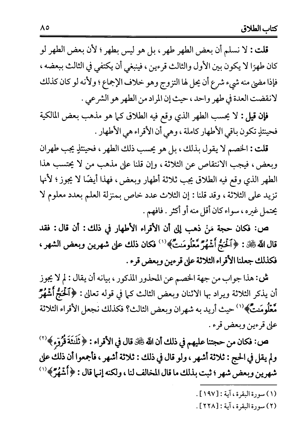 ش: هذا جواب من جهة الخصم عن المحذور المذكور، بيانه أن يقال: لم لا يجوز أن يذكر الثلاثة ويراد بها الاثنان وبعض الثالث كما في قوله تعالى: {الْحَجُّ أَشْهُرٌ مَعْلُومَاتٌ} (1) حيث أريد به شهران وبعض الثالث؟ فكذلك نجعل الأقراء الثلاثة على قرءين وبعض قرء.