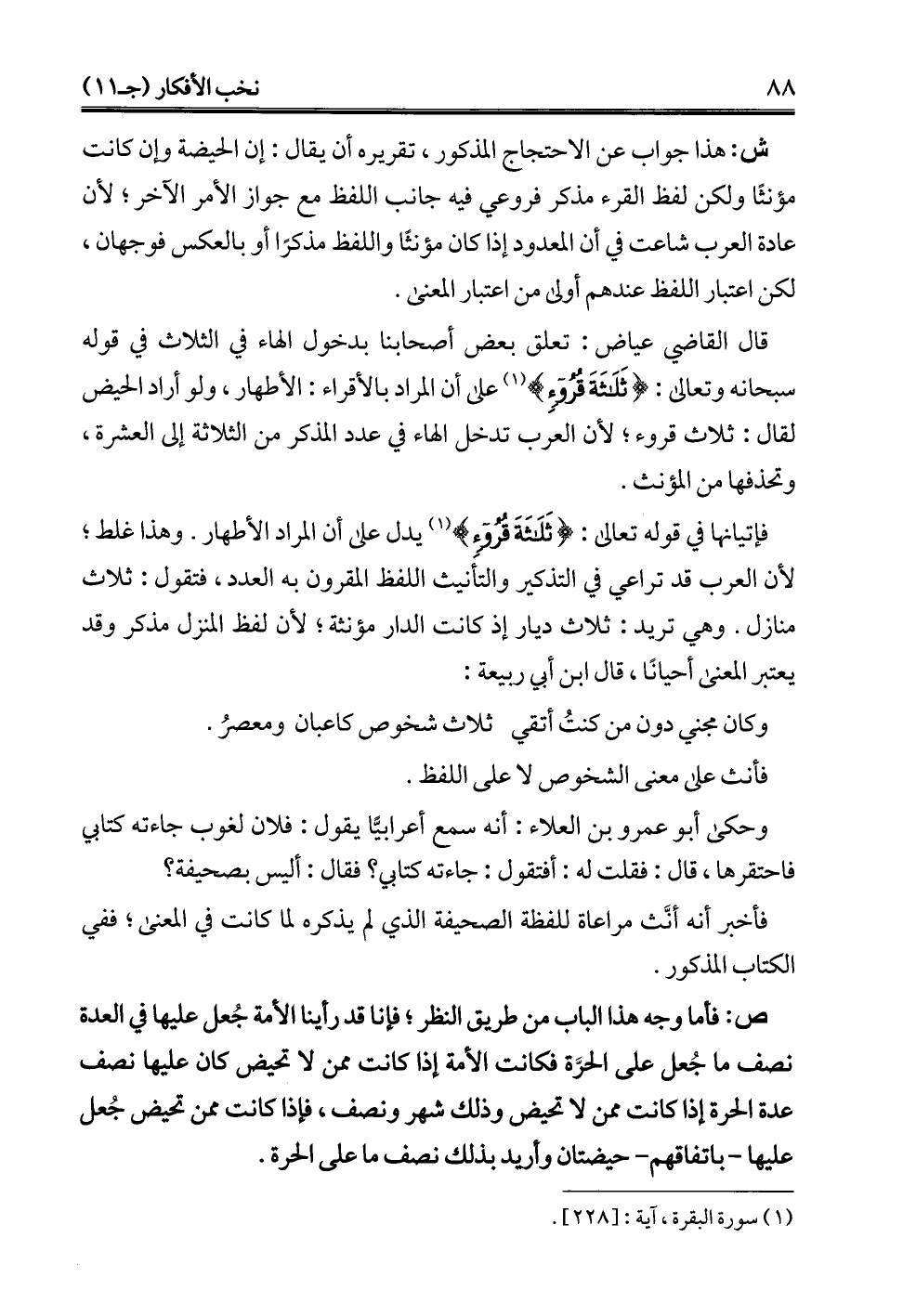 ش: هذا جواب عن الاحتجاج المذكور، تقريره أن يقال: إن الحيضة وإن كانت مؤنثًا ولكن لفظ القرء مذكر فروعي فيه جانب اللفظ مع جواز الأمر الآخر؛ لأن عادة العرب شاعت في أن المعدود إذا كان مؤنثًا واللفظ مذكرًا أو بالعكس فوجهان، لكن اعتبار اللفظ عندهم أولى من اعتبار المعنى.
