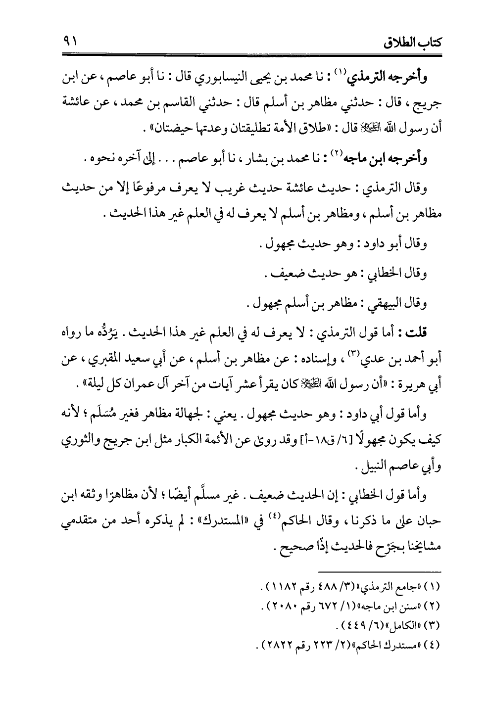 وأخرجه الترمذي (¬1): نا محمد بن يحيى النيسابوري قال: نا أبو عاصم، عن ابن جريج، قال: حدثني مظاهر بن أسلم قال: حدثني القاسم بن محمد، عن عائشة أن رسول الله -عليه السلام- قال: "طلاق الأمة تطليقتان وعدتها حيضتان".