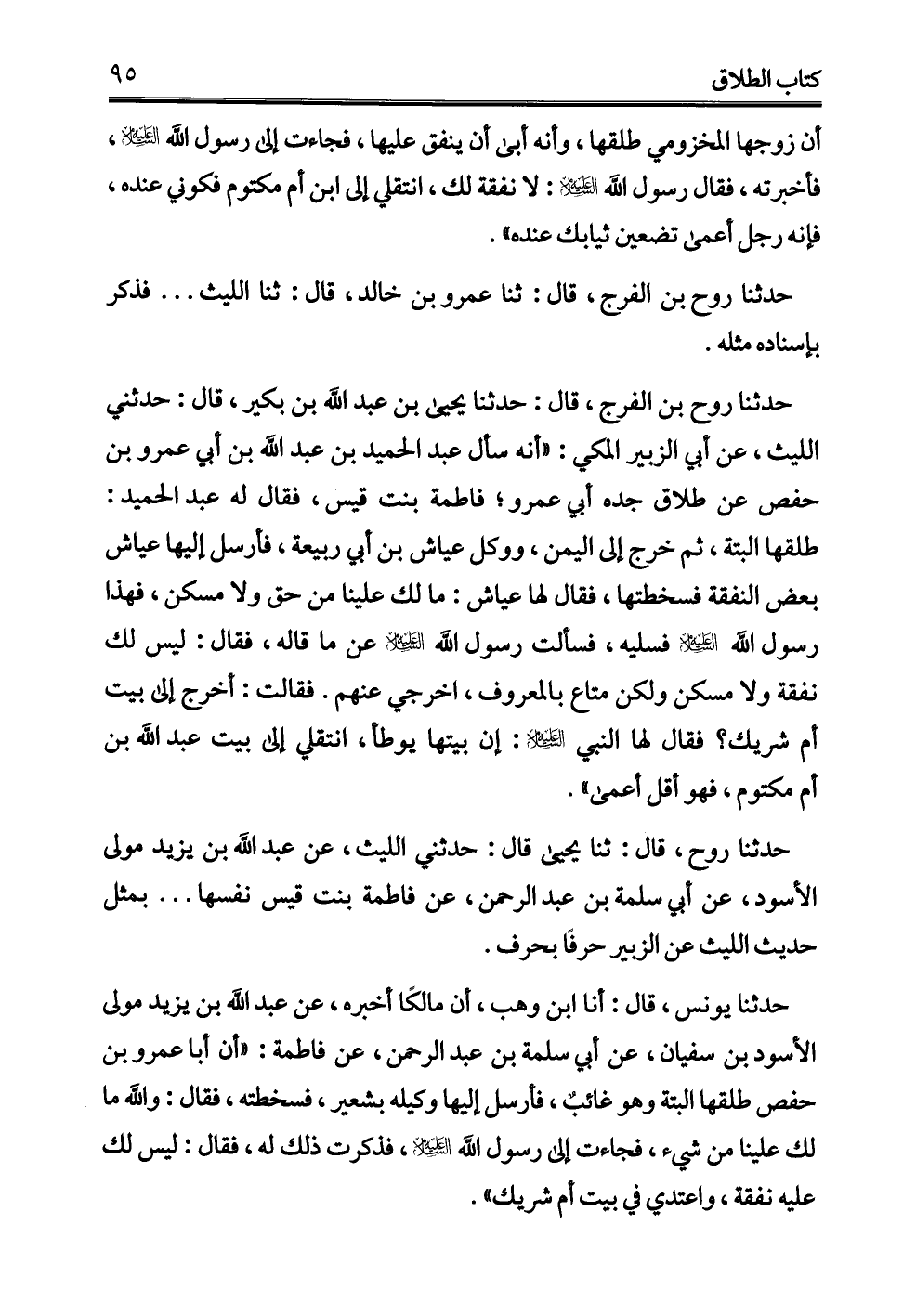 حدثنا روح بن الفرج، قال: حدثنا يحيى بن عبد الله بن بكير، قال: حدثني الليث، عن أبي الزبير المكي: "أنه سأل عبد الحميد بن عبد الله بن أبي عمرو بن حفص عن طلاق جده أبي عمرو؛ فاطمة بنت قيس، فقال له عبد الحميد: طلقها البتة، ثم خرج إلى اليمن، ووكل عياش بن أبي ربيعة، فأرسل إليها عياش بعض النفقة فسخطتها، فقال لها عياش: ما لك علينا من حق ولا مسكن، فهذا رسول الله -عليه السلام- فسليه، فسألت رسول الله -عليه السلام- عن ما قاله، فقال: ليس لك نفقة ولا مسكن ولكن متاع بالمعروف، اخرجي عنهم. فقالت: أخرج إلى بيت أم شريك؟ فقال لها النبي -عليه السلام-: إن بيتها يوطأ، انتقلي إلى بيت عبد الله بن أم مكتوم، فهو أقل أعمى".