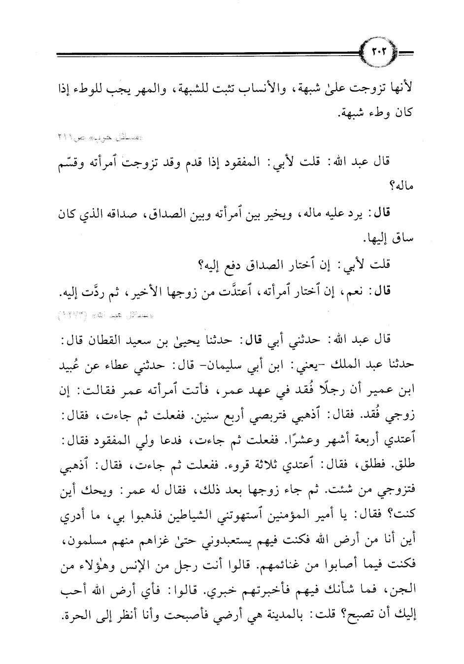 قال عبد اللَّه: حدثني أبي قال: حدثنا يحيى بن سعيد القطان قال: حدثنا عبد الملك -يعني: ابن أبي سليمان- قال: حدثني عطاء عن عُبيد بن عمير أن رجلًا فُقد في عهد عمر، فأتت امرأته عمر فقالت: إن زوجي فُقد. فقال: اذهبي فتربصي أربع سنين. ففعلت ثم جاءت، فقال: اعتدي أربعة أشهر وعشرًا. ففعلت ثم جاءت، فدعا ولي المفقود فقال: طلق. فطلق، فقال: اعتدي ثلاثة قروء. ففعلت ثم جاءت، فقال: اذهبي فتزوجي من شئت. ثم جاء زوجها بعد ذلك، فقال له عمر: ويحك أين كنت؟ فقال: يا أمير المؤمنين استهوتني الشياطين فذهبوا بي، ما أدري أين أنا من أرض اللَّه فكنت فيهم يستعبدوني حتى غزاهم منهم مسلمون، فكنت فيما أصابوا من غنائمهم. قالوا أنت رجل من الإنس وهؤلاء من الجن، فما شأنك فيهم فأخبرتهم خبري. قالوا: فأي أرض اللَّه أحب إليك أن تصبح؟ قلت: بالمدينة هي أرضي فأصبحت وأنا أنظر إلى الحرة.