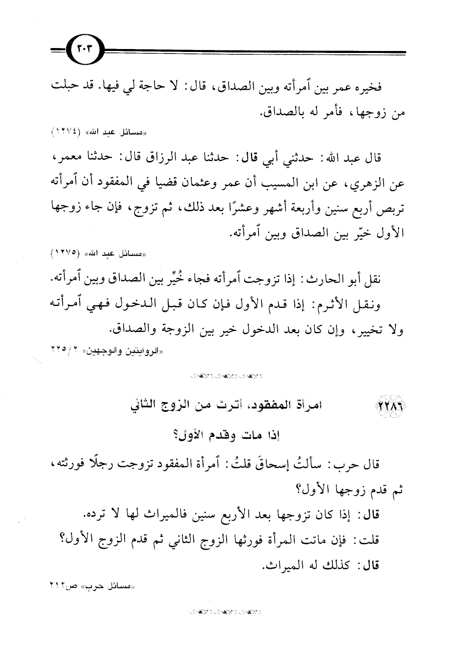 قال حرب: سألتُ إسحاق قلتُ: امرأة المفقود تزوجت رجلًا فورثته، ثم قدم زوجها الأول؟