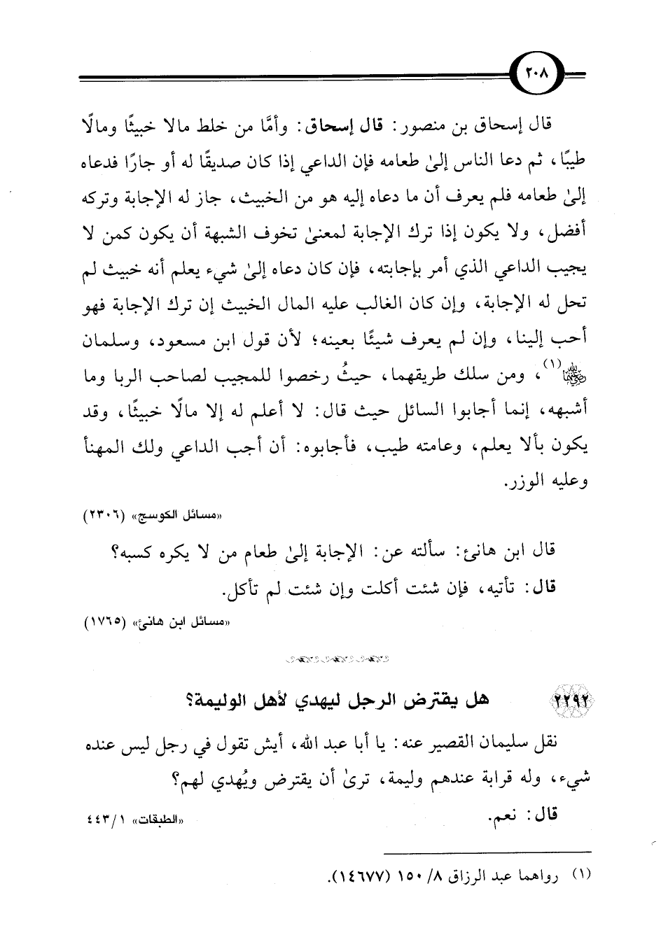 قال إسحاق بن منصور: قال إسحاق: وأمَّا من خلط مالا خبيثًا ومالًا طيبًا، ثم دعا الناس إلى طعامه فإن الداعي إذا كان صديقًا له أو جارًا فدعاه إلى طعامه فلم يعرف أن ما دعاه إليه هو من الخبيث، جاز له الإجابة وتركه أفضل، ولا يكون إذا ترك الإجابة لمعنى تخوف الشبهة أن يكون كمن لا يجيب الداعي الذي أمر بإجابته، فإن كان دعاه إلى شيء يعلم أنه خبيث لم تحل له الإجابة، وإن كان الغالب عليه المال الخبيث إن ترك الإجابة فهو أحب إلينا، وإن لم يعرف شيئًا بعينه؛ لأن قول ابن مسعود، وسلمان -رضي اللَّه عنهما- (¬1)، ومن سلك طريقهما، حيثُ رخصوا للمجيب لصاحب الربا وما أشبهه، إنما أجابوا السائل حيث قال: لا أعلم له إلا مالًا خبيثًا، وقد يكون بألا يعلم، وعامته طيب، فأجابوه: أن أجب الداعي ولك المهنأ وعليه الوزر.