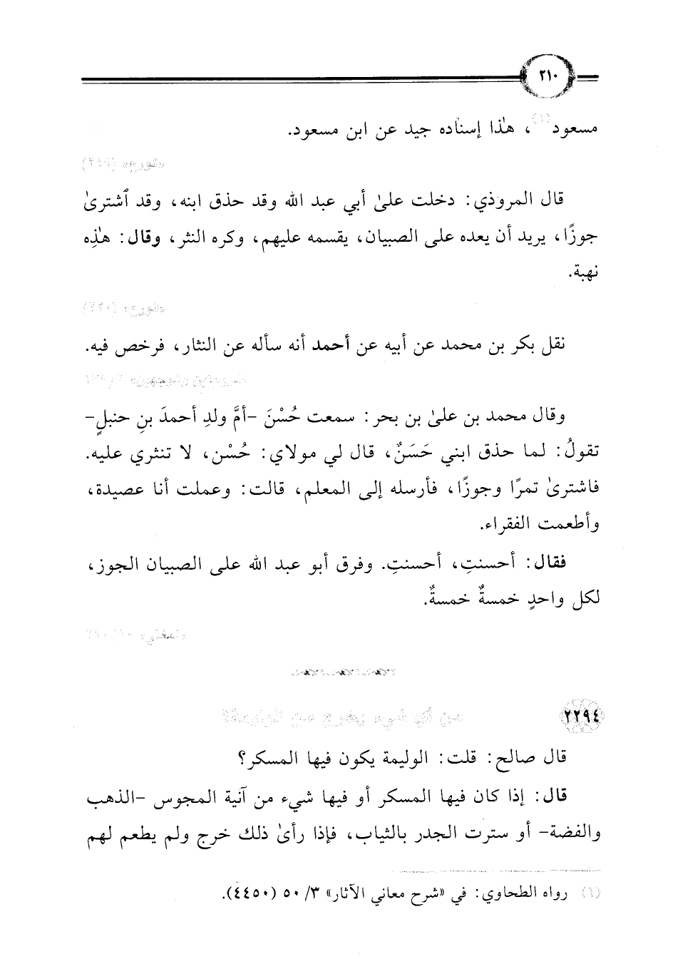 قال المروذي. دخلت على أبي عبد اللَّه وقد حذق ابنه، وقد اشترى جوزًا، يريد أن يعده على الصبيان، يقسمه عليهم، وكره النثر، وقال: هذِه نهبة.