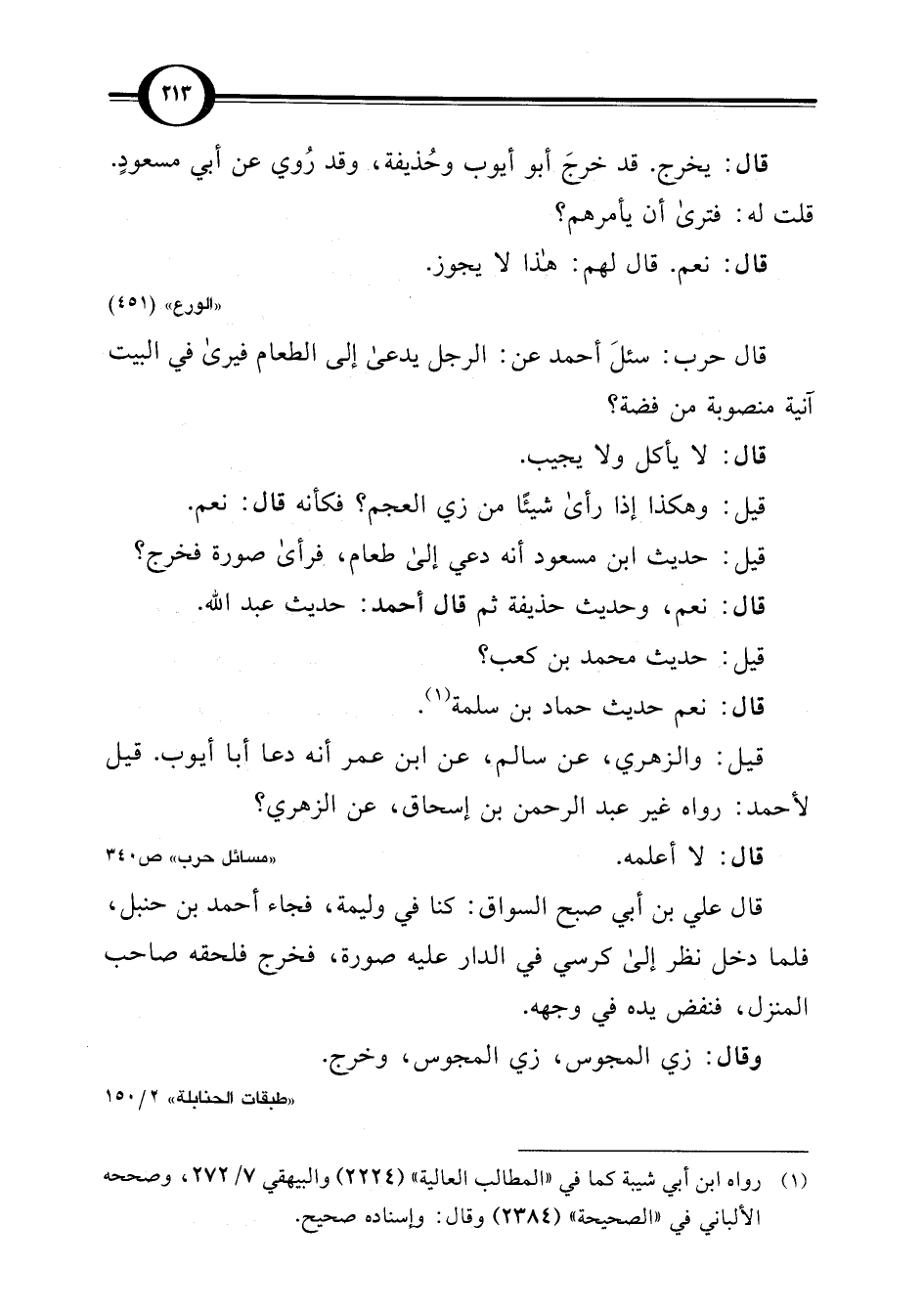 قال حرب: سئلَ أحمد عن: الرجل يدعى إلى الطعام فيرى في البيت آنية منصوبة من فضة؟