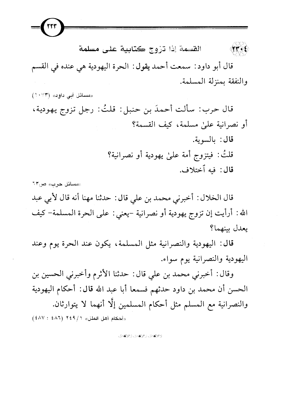 قال أبو داود: سمدت أحمد يقول: الحرة اليهودية هي عنده في القسم والنفقة بمنزلة المسلمة.