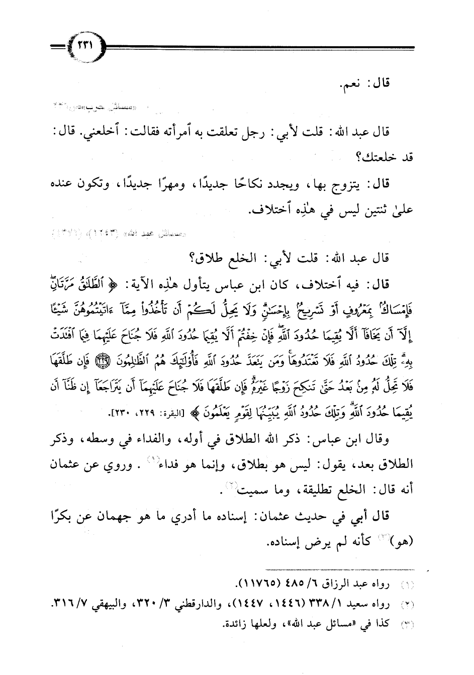 قال عبد اللَّه: قلت لأبي: الخلع طلاق؟