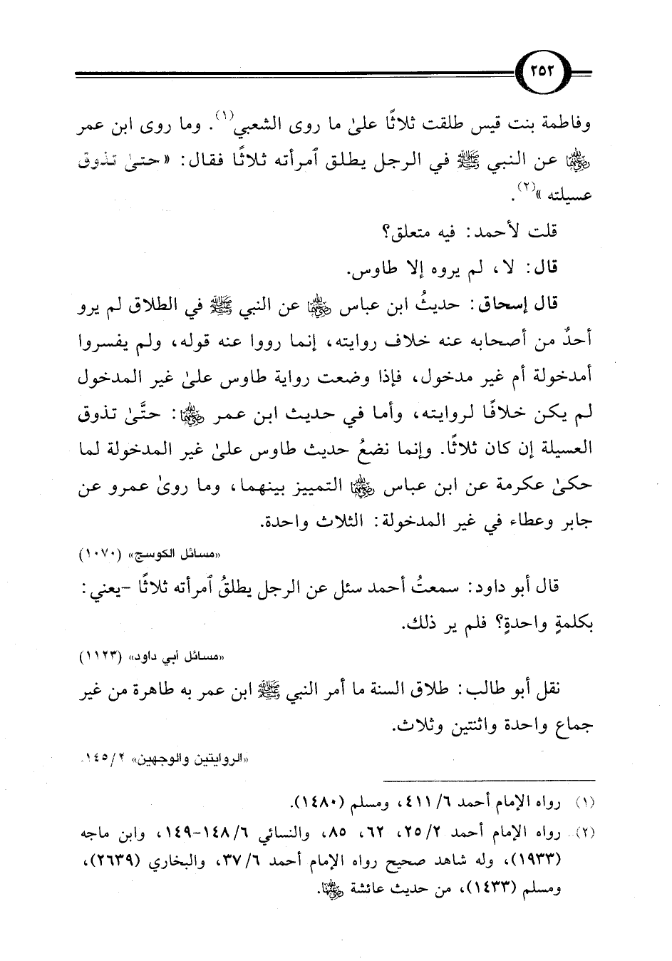 قال إسحاق: حديثُ ابن عباس -رضي اللَّه عنهما- عن النبي -صلى اللَّه عليه وسلم- في الطلاق لم يرو أحدٌ من أصحابه عنه خلاف روايته، إنما رووا عنه قوله، ولم يفسروا أمدخولة أم غير مدخول، فإذا وضعت رواية طاوس على غير المدخول لم يكن خلافًا لروايته، وأما في حديث ابن عمر -رضي اللَّه عنهما-: حتى تذوق العسيلة إن كان ثلاثًا. وإنما نضعُ حديث طاوس على غير المدخولة لما حكى عكرمة عن ابن عباس -رضي اللَّه عنهما- التمييز بينهما، وما روى عمرو عن جابر وعطاء في غير المدخولة: الثلاث واحدة.