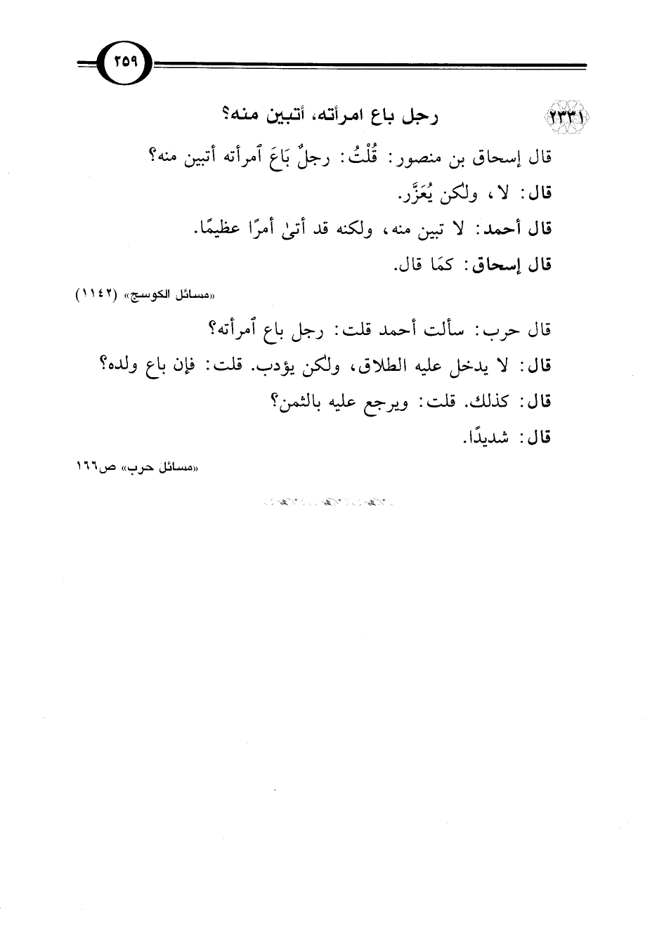 قال إسحاق بن منصور: قُلْتُ: رجلٌ بَاعَ امرأته أتبين منه؟