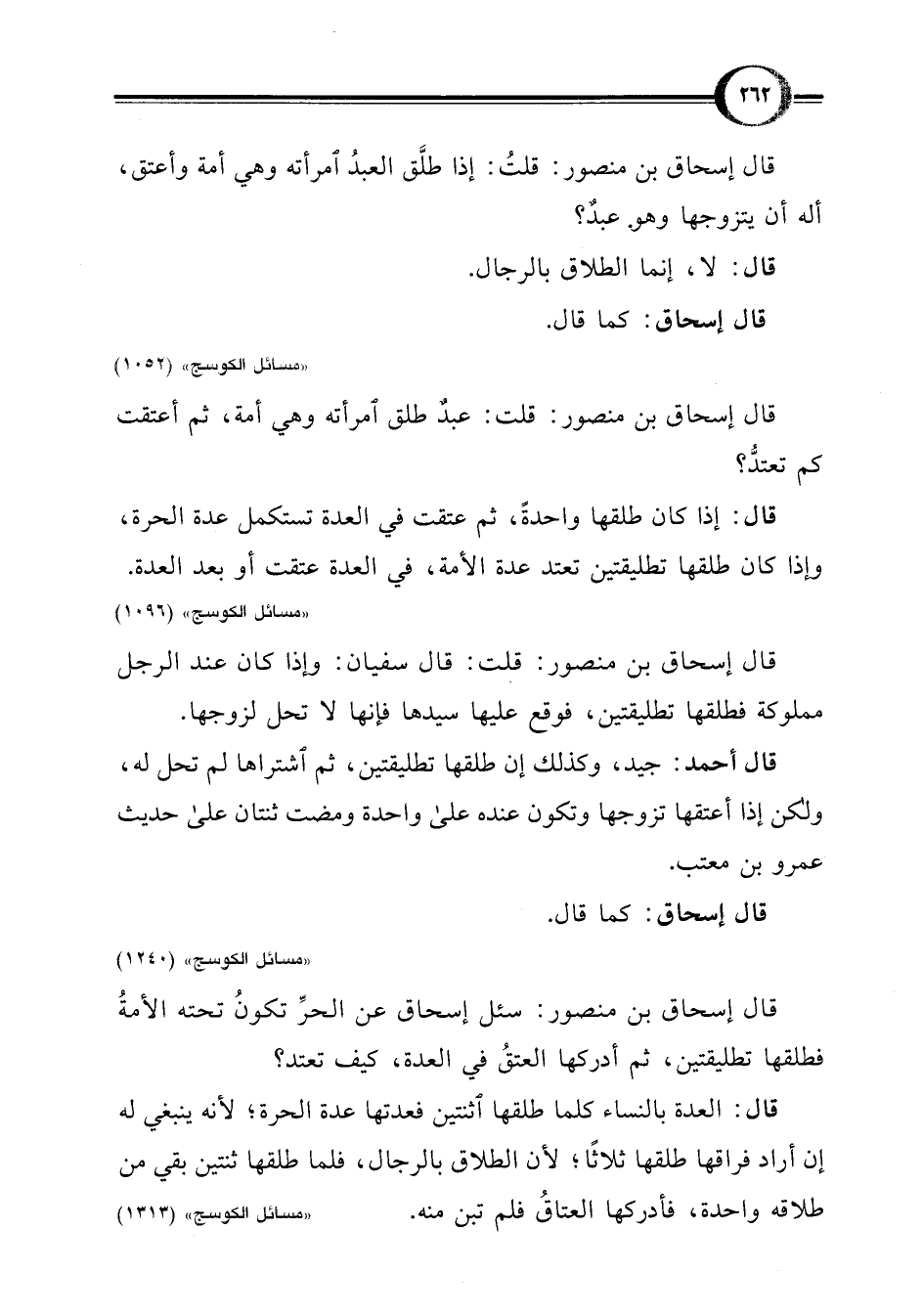 قال إسحاق بن منصور: سئل إسحاق عن الحرِّ تكونُ تحته الأمةُ فطلقها تطليقتين، ثم أدركها العتقُ في العدة، كيف تعتد؟