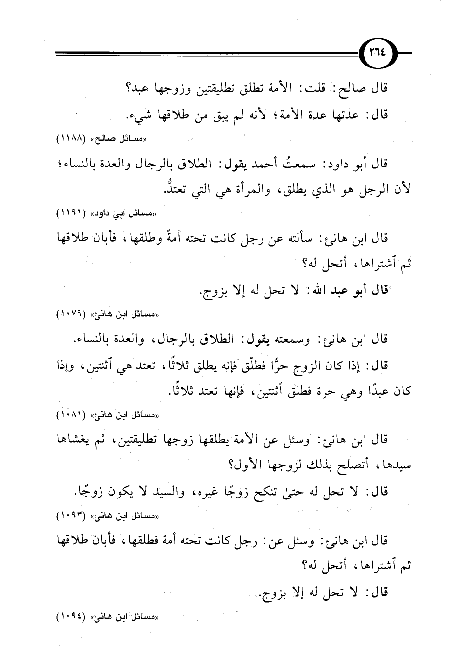 قال ابن هانئ: وسمعته يقول: الطلاق بالرجال، والعدة بالنساء.