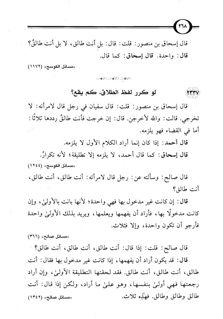 قال إسحاق بن منصور: قلت: قال: بل أنت طالق، لا بل أنت طالقٌ؟
