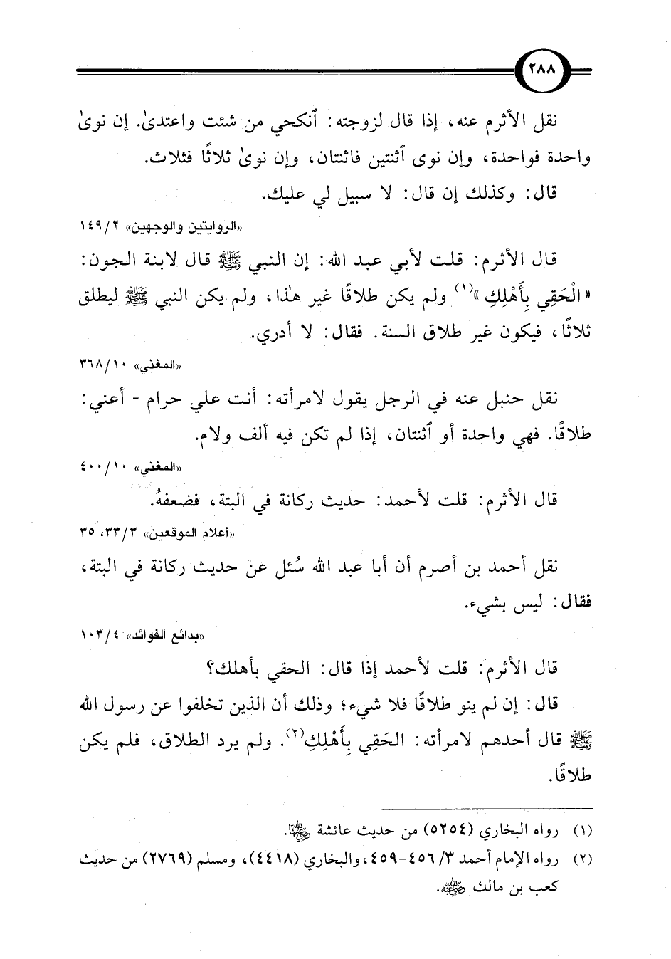 قال الأثرم: قلت لأحمد إذا قال: الحقي بأهلك؟