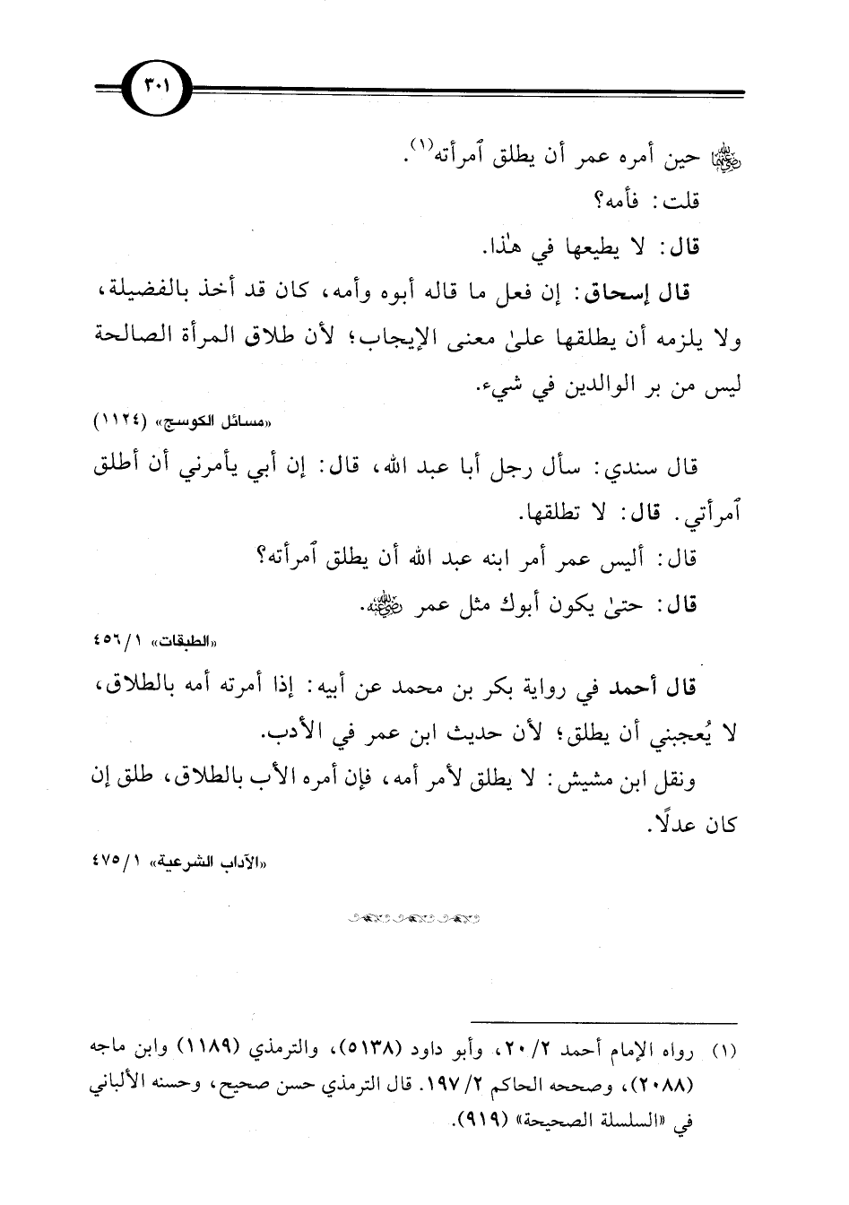 قال سندي؛ سأل رجل أبا عبد اللَّه، قال: إن أبي يأمرني أن أطلق امرأتي. قال: لا تطلقها.