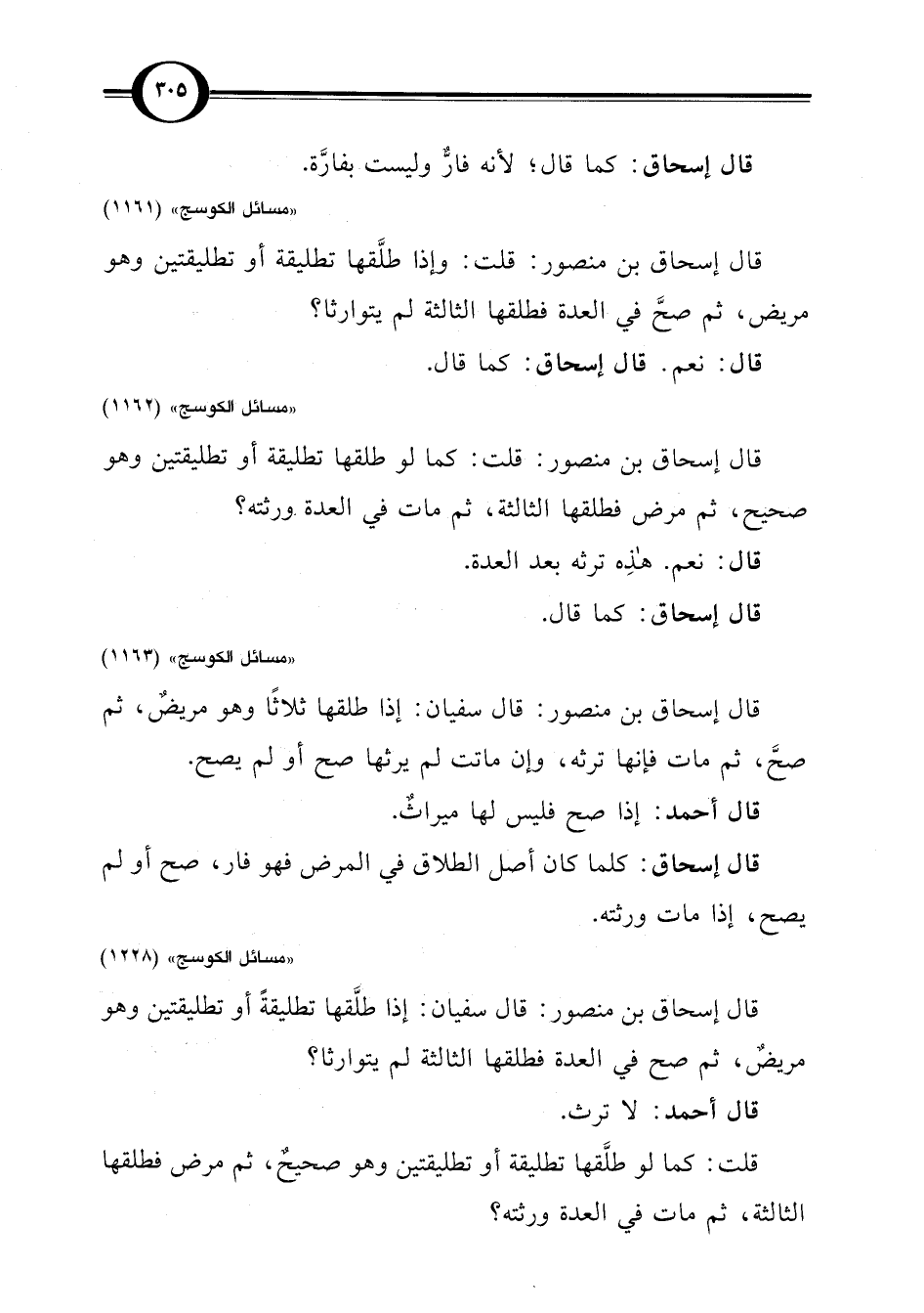 قال إسحاق بن منصور: قلت: كما لو طلقها تطليقة أو تطليقتين وهو صحيح، ثم مرض فطلقها الثالثة، ثم مات في العدة. ورثته؟