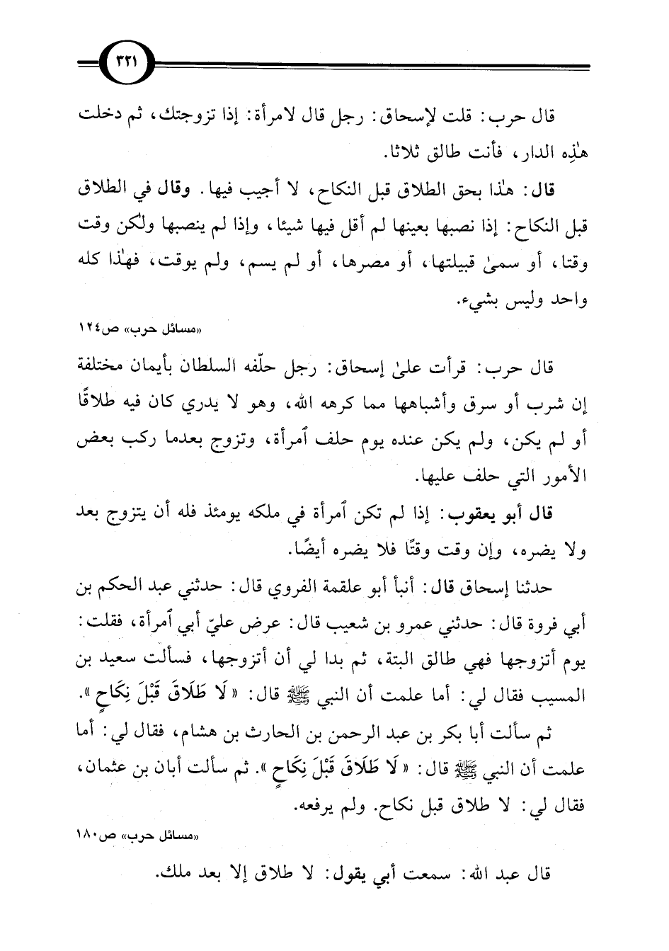 قال حرب: قلت لإسحاق: رجل قال لامرأة: إذا تزوجتك، ثم دخلت هذِه الدار، فأنت طالق ثلاثا.