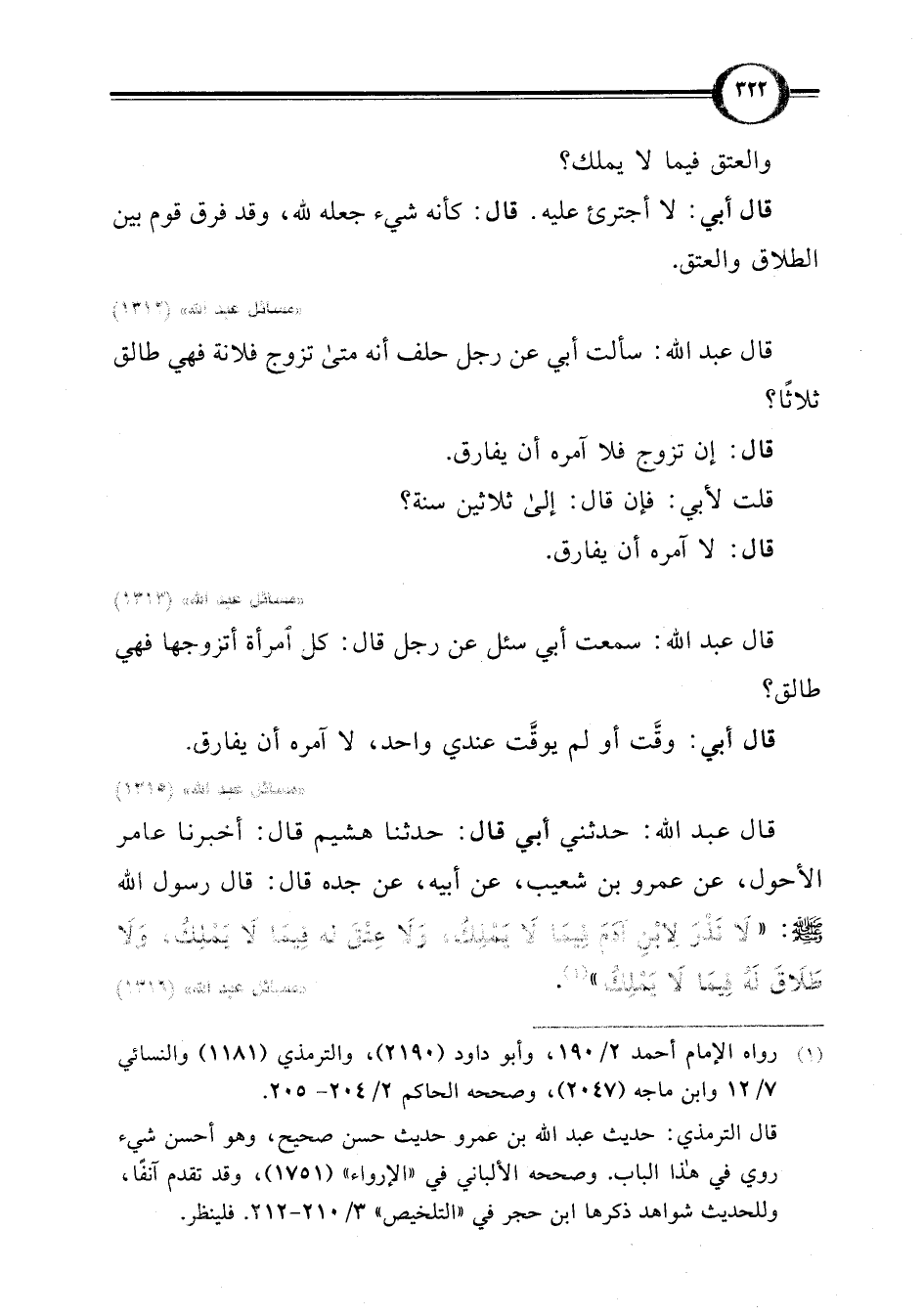 قال عبد اللَّه: حدثني أبي قال: حدثنا هشيم قال: أخبرنا عامر الأحول، عن عمرو بن شعيب، عن أبيه، عن جده قال: قال رسول اللَّه -صلى اللَّه عليه وسلم-: "لَا نَذْرَ لِابْنِ آدَمَ فِيمَا لَا يَمْلِكُ وَلَا عِتْقَ له فِيمَا لَا يَمْلِكُ، وَلَا طَلَاقَ لَهُ فِيمَا لَا يَمْلِكُ" (¬1).