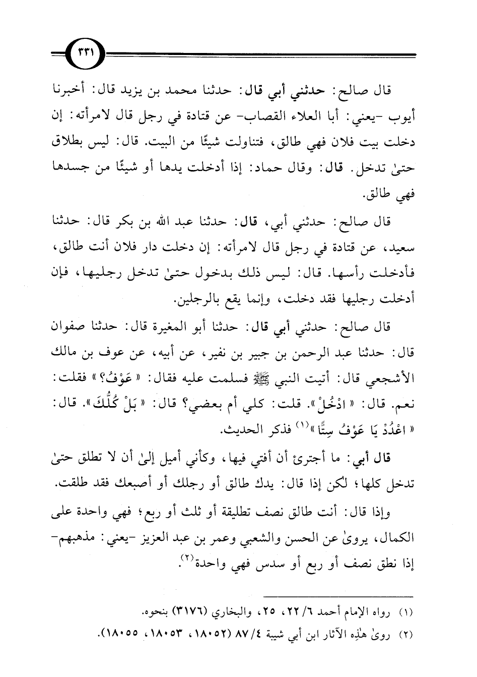 قال صالح: حدثني أبي، قال: حدثنا عبد اللَّه بن بكر قال: حدثنا سعيد، عن قتادة في رجل قال لامرأته: إن دخلت دار فلان أنت طالق، فأدخلت رأسها. قال: ليس ذلك بدخول حتى تدخل رجليها، فإن أدخلت رجليها فقد دخلت، وإنما يقع بالرجلين.
