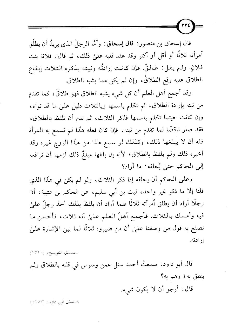 قال إسحاق بن منصور: قال إسحاق: وأمَّا الرجلُ الذي يريدُ أن يطلِّق امرأته ثلاثًا أو أقل أو أكثر وقد عقد قلبه على ذلك، ثم قال: فلانة بنت فلانٍ. ولم يقل: طالقٌ. فإن كانت إرادتُه ونيته بذكره الثلاث إيقاع الطلاق عليه وقع الطلاقُ، وإن لم يكن مما يشبه الطلاق.