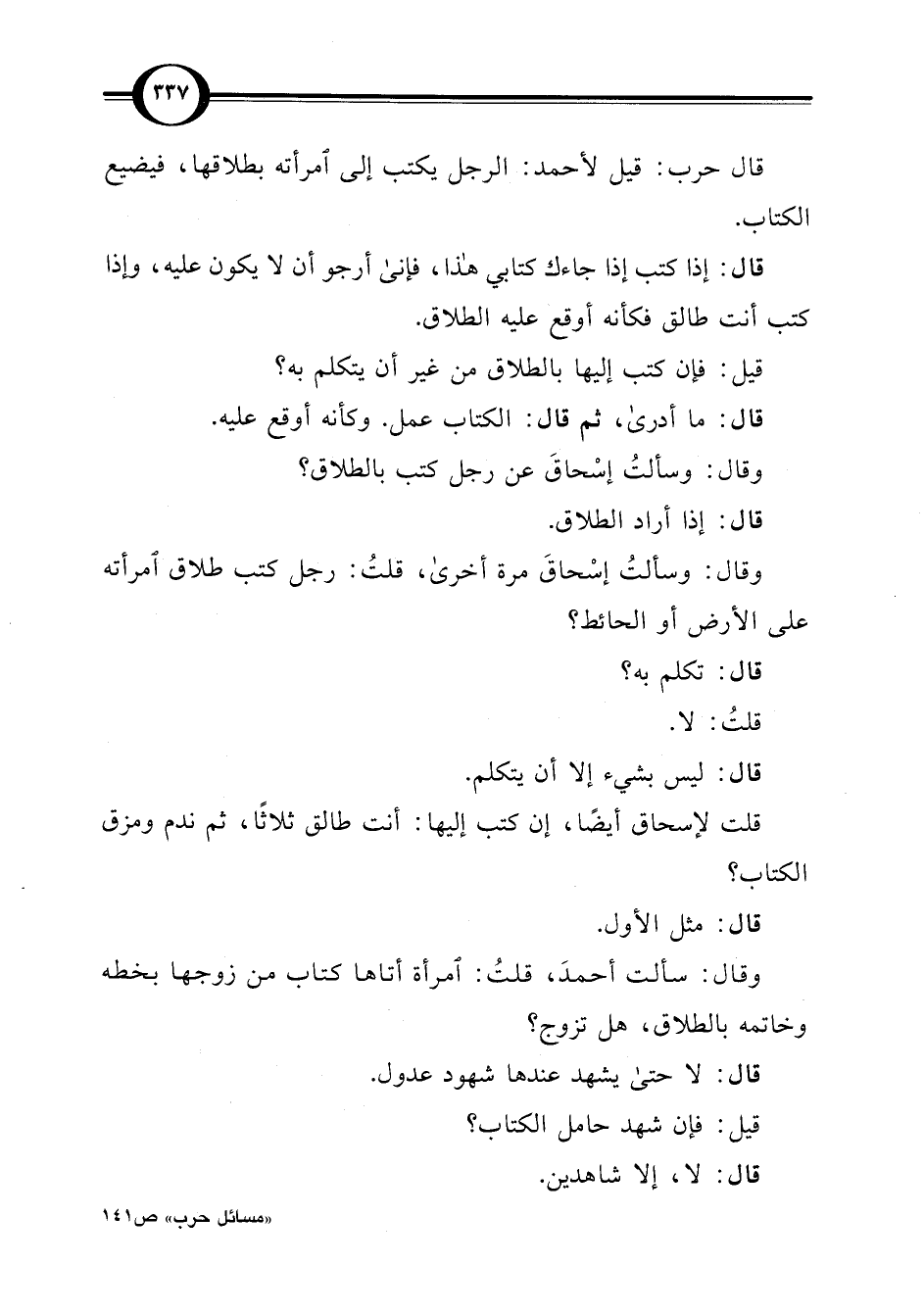 وقال: وسألتُ إسْحاقَ مرة أخرى، قلتُ: رجل كتب طلاق امرأته على الأرض أو الحائط؟