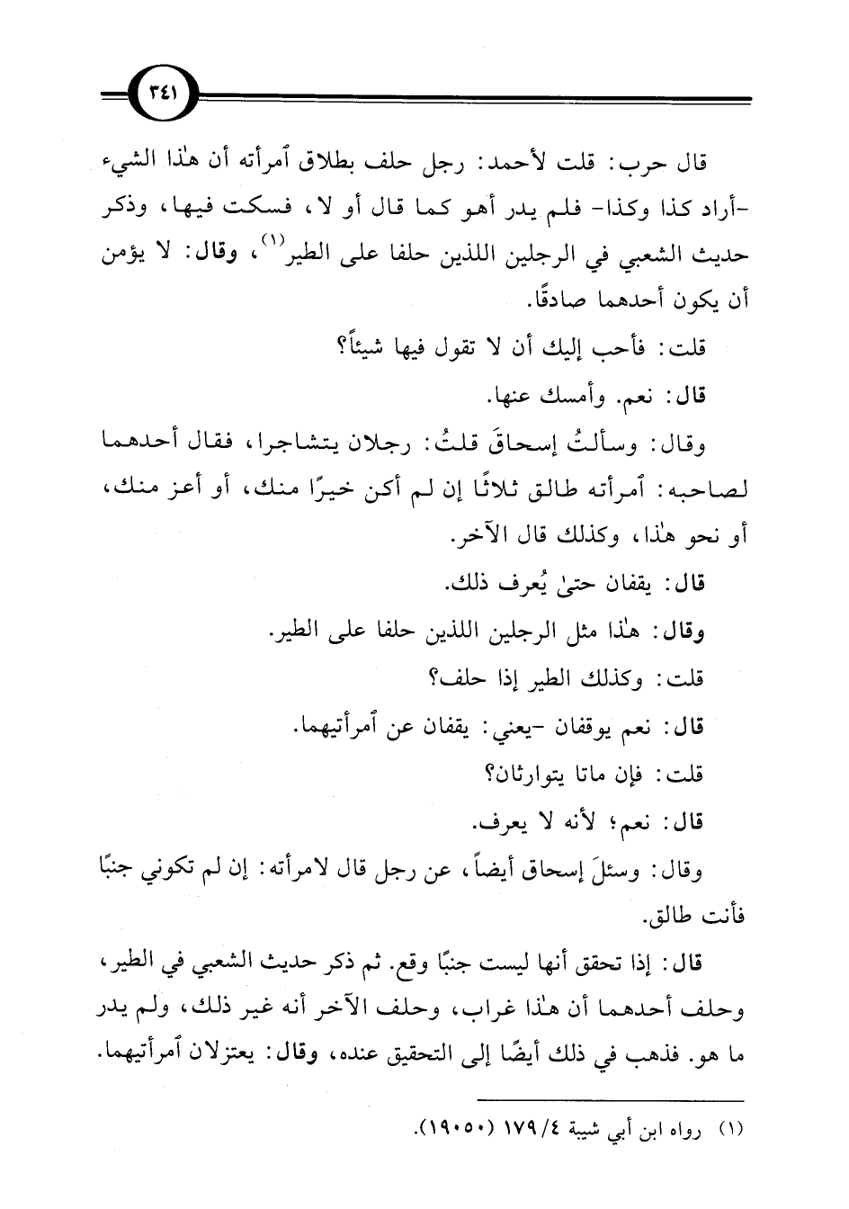 وقال: وسألتُ إسحاقَ قلتُ: رجلان يتشاجرا، فقال أحدهما لصاحبه: امرأته طالق ثلاثًا إن لم أكن خيرًا منك، أو أعز منك، أو نحو هذا، وكذلك قال الآخر.