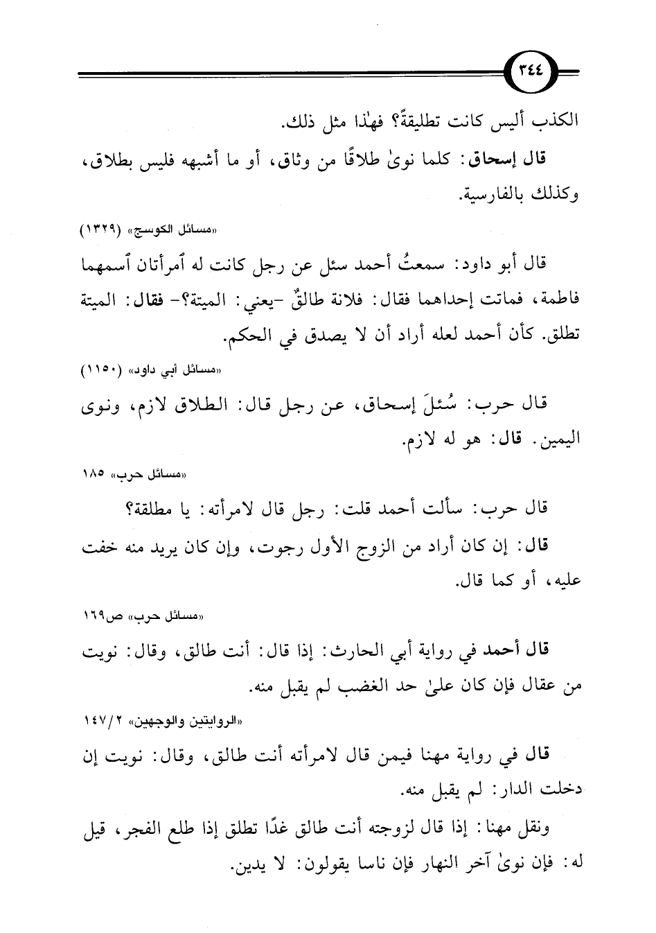 قال حرب: سُئلَ إسحاق، عن رجل قال: الطلاق لازم، ونوى اليمين. قال: هو له لازم.