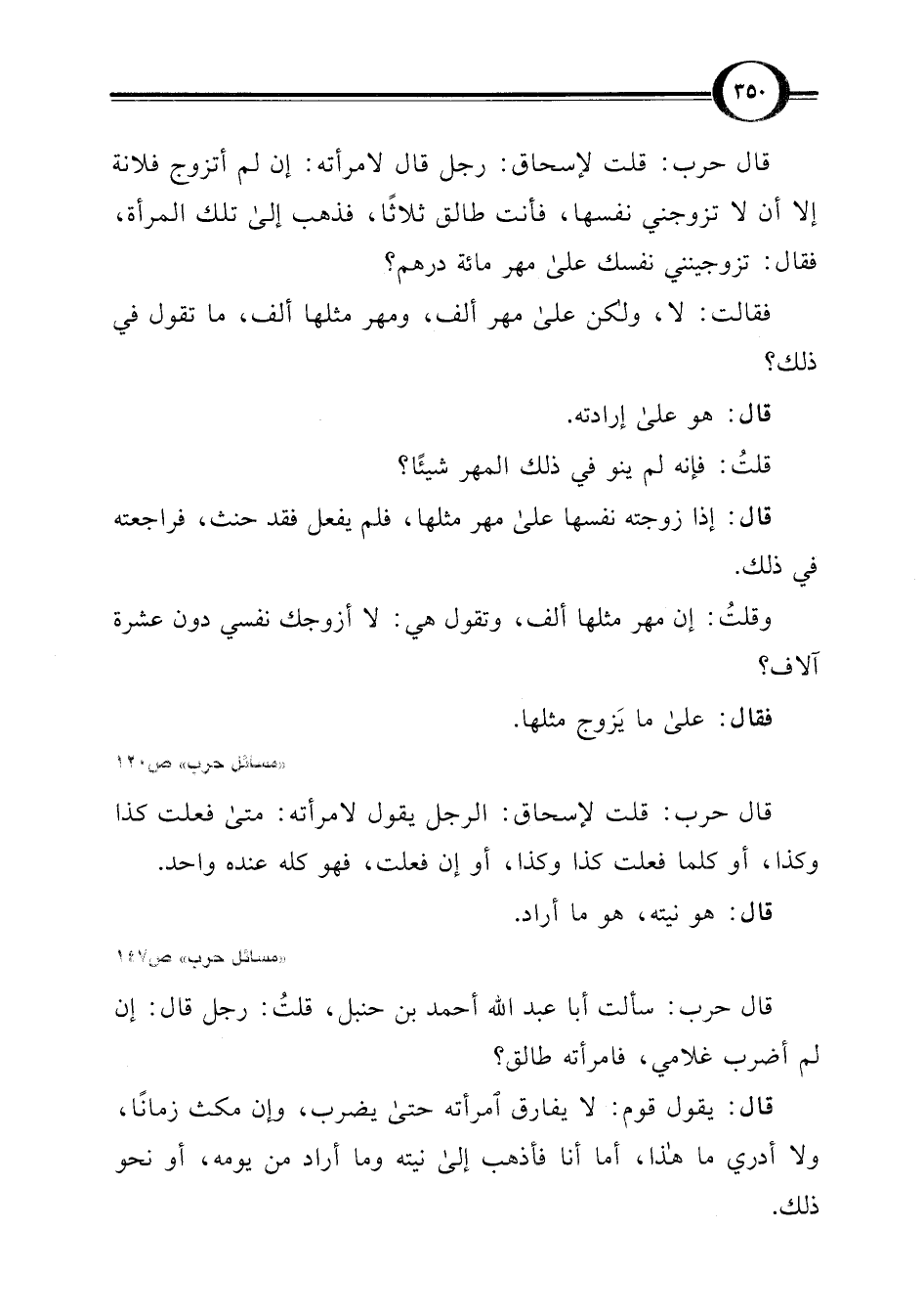 قال حرب: قلت لإسحاق: رجل قال لامرأته: إن لم أتزوج فلانة إلا أن لا تزوجني نفسها، فأنت طالق ثلاثًا، فذهب إلى تلك المرأة، فقال: تزوجينني نفسك على مهر مائة درهم؟