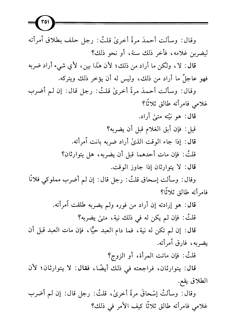 وقال: وسألت إسحاق قلتُ: رجل قال: إن لم أضرب مملوكي فلانًا فامرأته طالق ثلاثًا؟