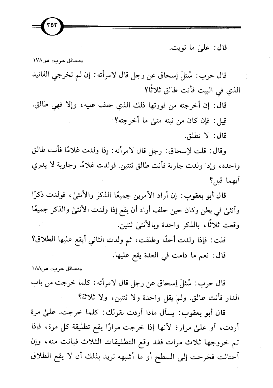 قال حرب: سُئلَ إسحاق عن رجل قال لامرأته: كلما خرجت من باب الدار فأنت طالق. ولم يقل واحدة ولا ثنتين، ولا ثلاثة؟