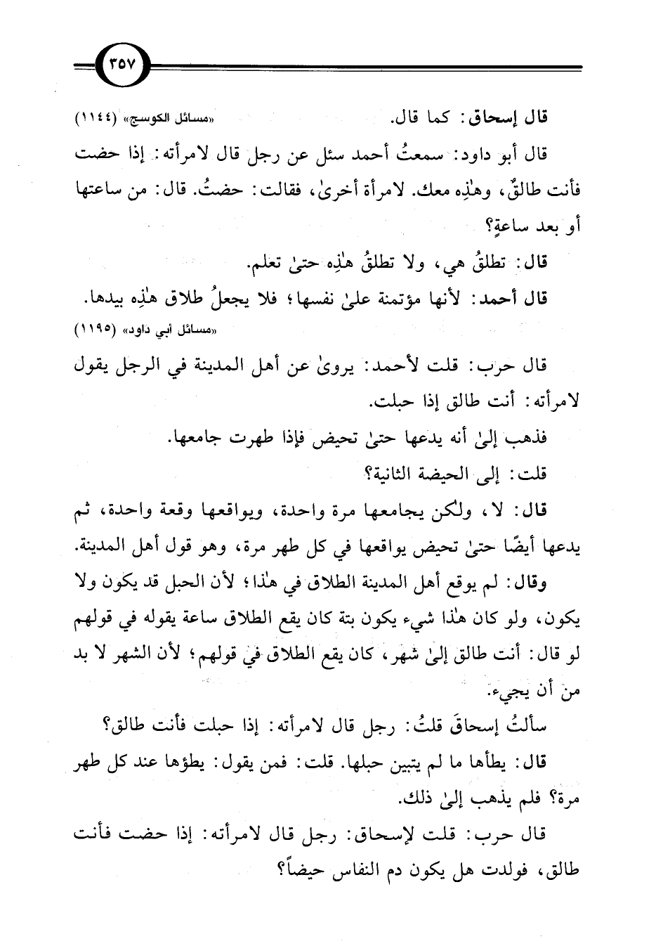 قال أبو داود: سمعتُ أحمد سئل عن رجل قال لامرأته: إذا حضت فأنت طالقٌ، وهذِه معك. لامرأة أخرى، فقالت: حضتُ. قال: من ساعتها أو بعد ساعةٍ؟