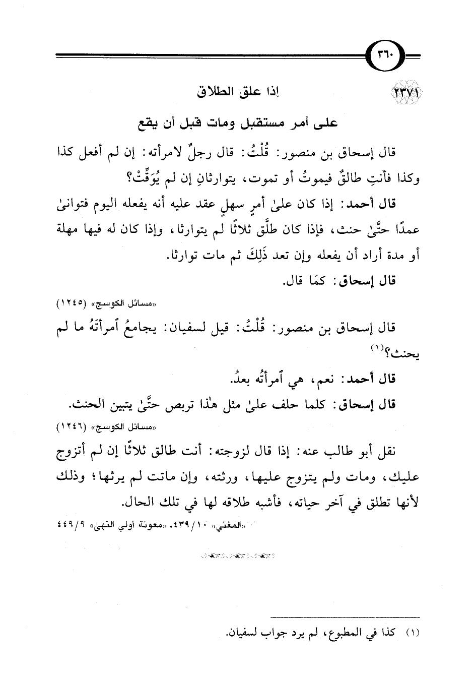 قال إسحاق بن منصور: قُلْتُ: قيل لسفيان: يجامعُ امرأتَهُ ما لم يحنث؟ (¬1)